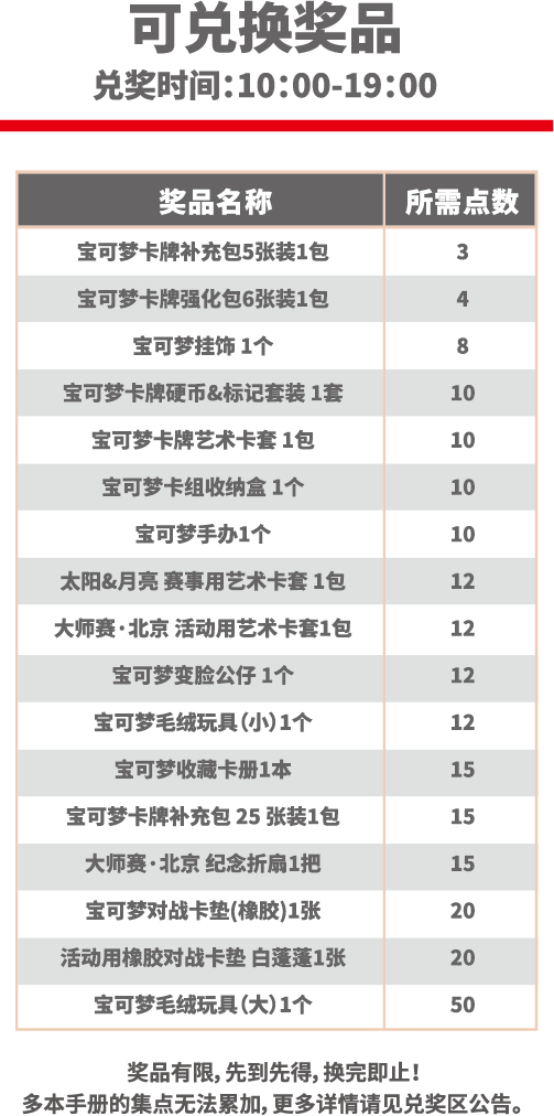 获得对应名次的公开组训练家可于比赛当天在【大师赛兑奖处】领取现场点数,少年组及儿童组训练家可于【少年组及儿童组裁判站】进行领取。详情可咨询现场工作人员。