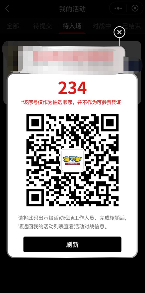 7.进入等待区后,我们会根据实际人数,分批次公开可进行现场核销的号码区间,在该区间内的训练家即为现场补录成功。训练家需出示【抽选顺序号码界面】的核销码排队依次核销入场。请听从现场工作人员的指示有序等候。