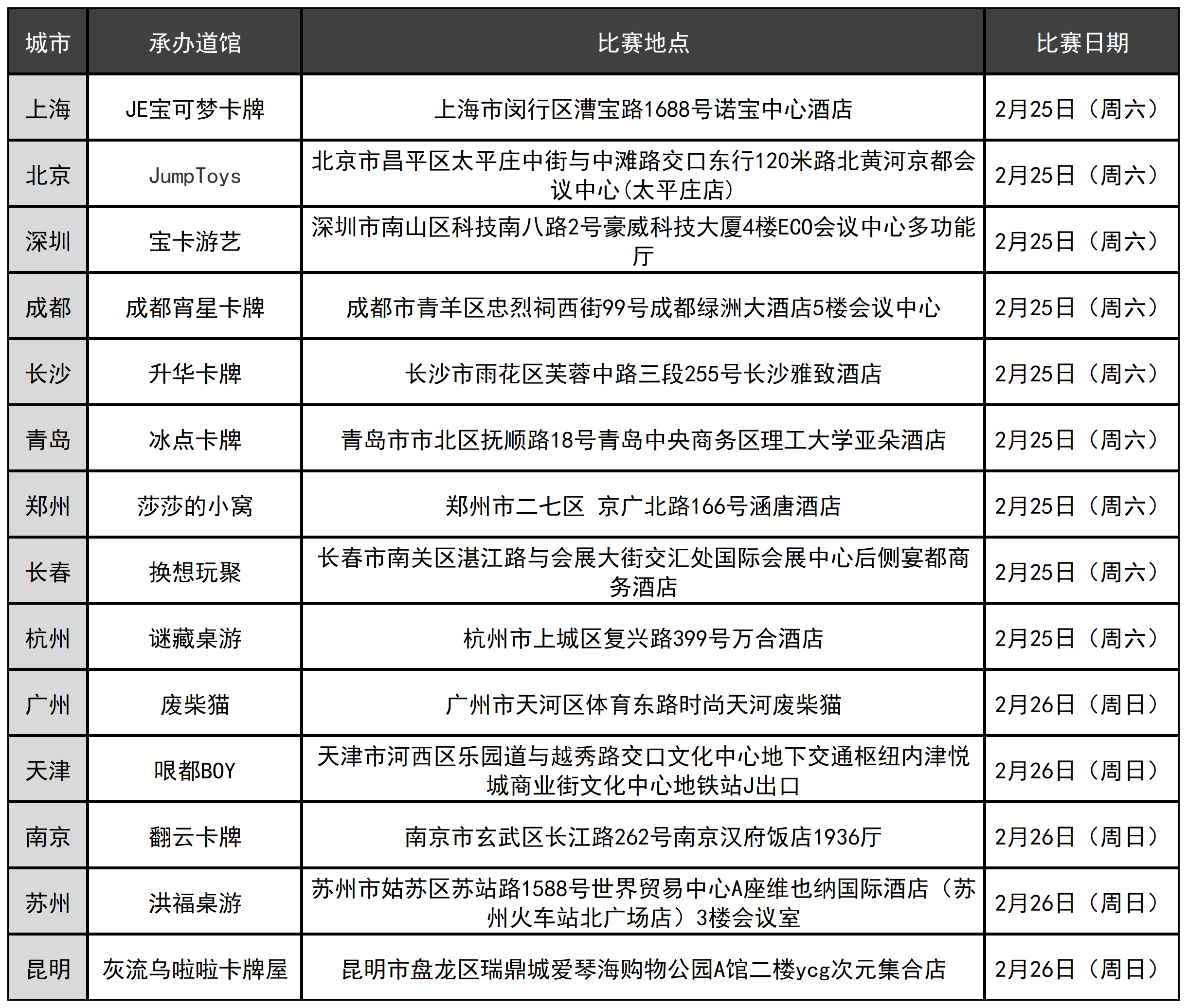 【交相辉映挑战赛】第二周比赛日期为2月25日(周六)和26日(周日)。现公布第二周的比赛地点: