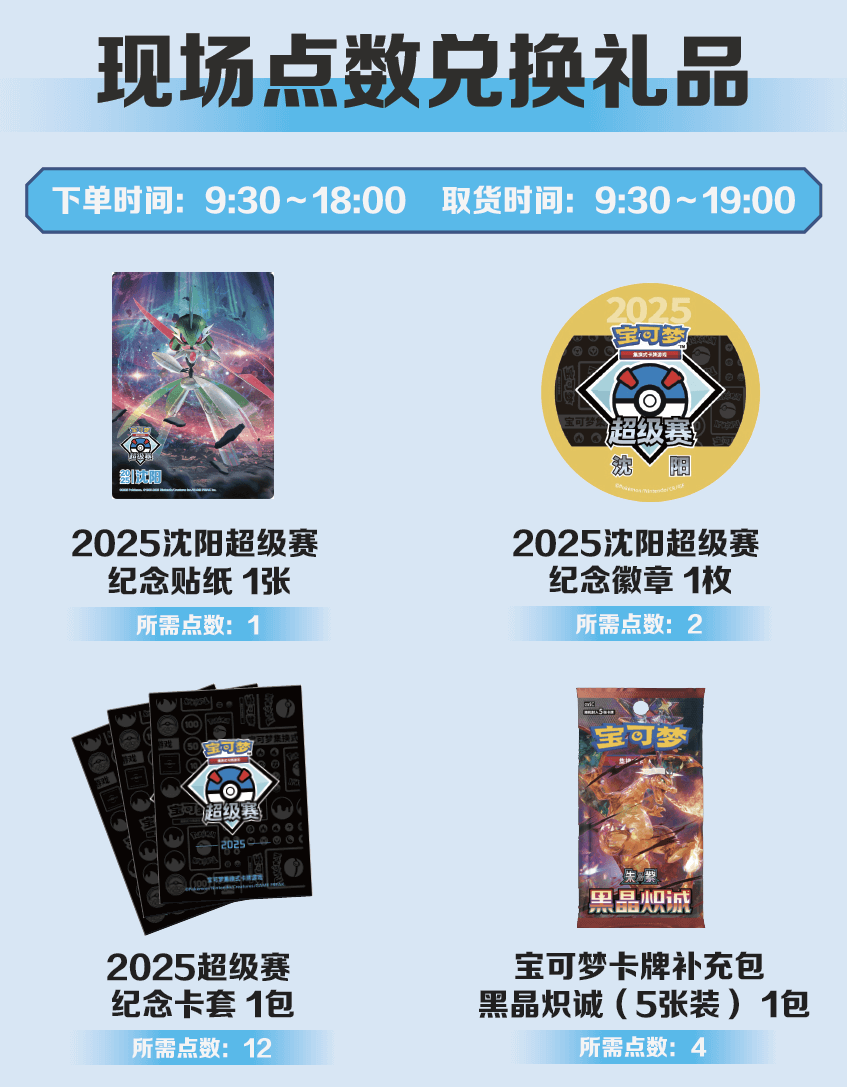 在 “沈阳超级赛” 各组比赛获得一定胜场数或取得一定名次,或参加宝可梦卡牌场外活动将有机会获得“沈阳超级赛”现场点数。训练家可积累点数,在现场的“现场点数兑奖处”兑换相应的礼品,更有超级赛专属礼品等你来拿!