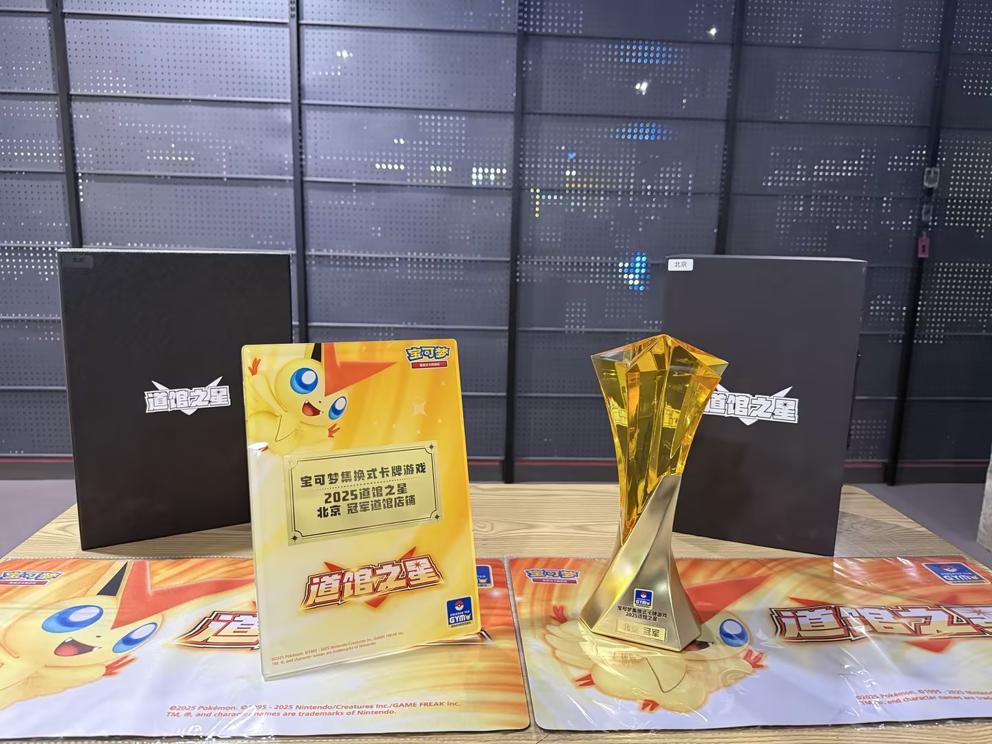 每位冠军都在现场获得了专属奖杯1个,2025道馆之星 橡胶对战卡垫1张和“道馆之星选拔赛”冠军奖:“比克提尼ex”特别艺术插画闪卡1张。每位冠军所代表的道馆都获得了专属奖砖1个,2025道馆之星 橡胶对战卡垫1张。