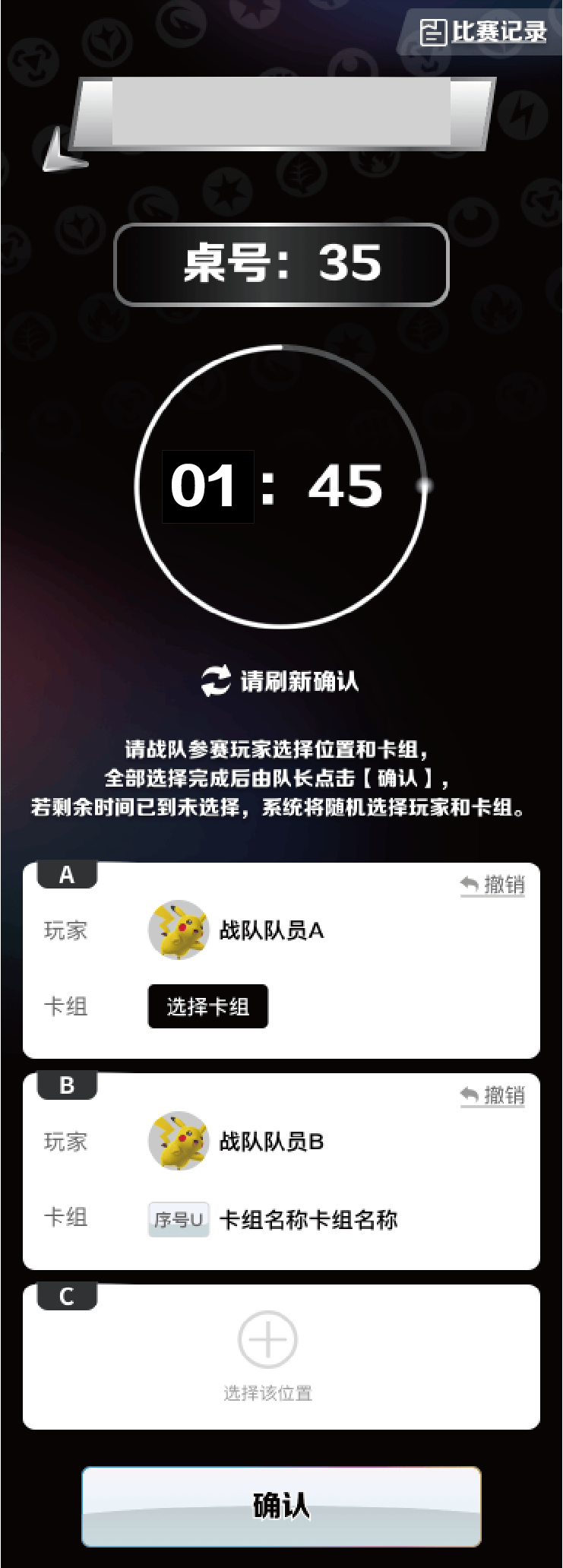 卡组及队员选择阶段:双方成员需选择自己战队要出战的3位队员,将其分配至对应坐席号并选择队员各自使用的卡组。若在倒计时结束时未选择完毕,系统将随机分配参赛卡组及参赛队员。