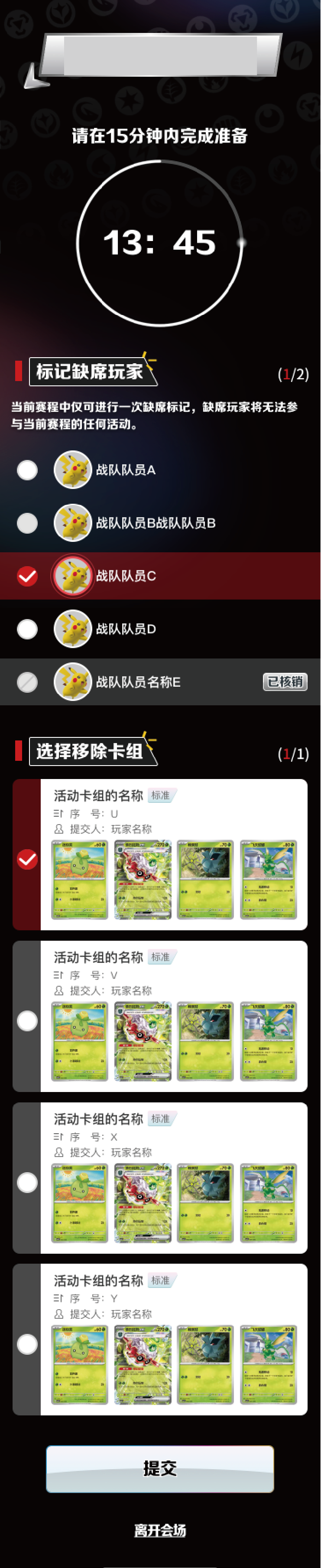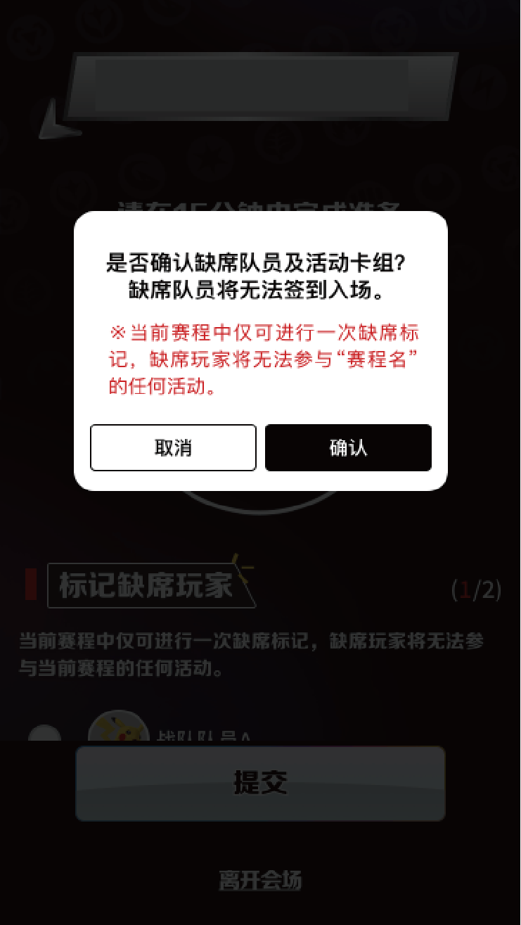 活动开始后,参赛战队首次加入对应会场活动后,队长需要在15分钟倒计时结束前,标记缺席队员并调整卡组数量。