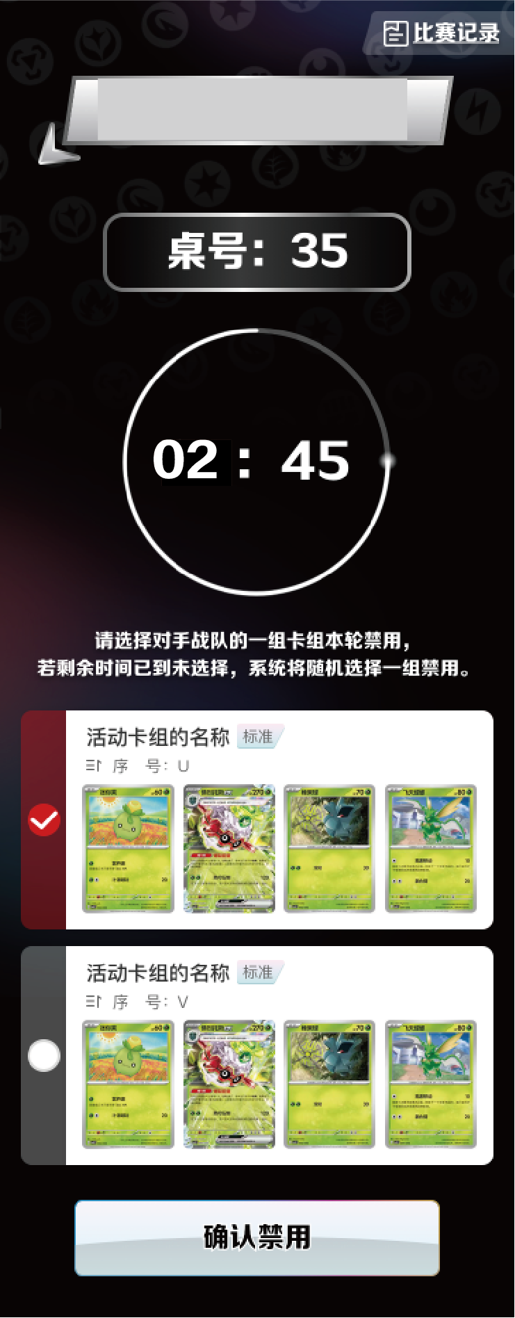 匹配成功后,将显示对战桌号,并进入最多3分钟的卡组禁用阶段。