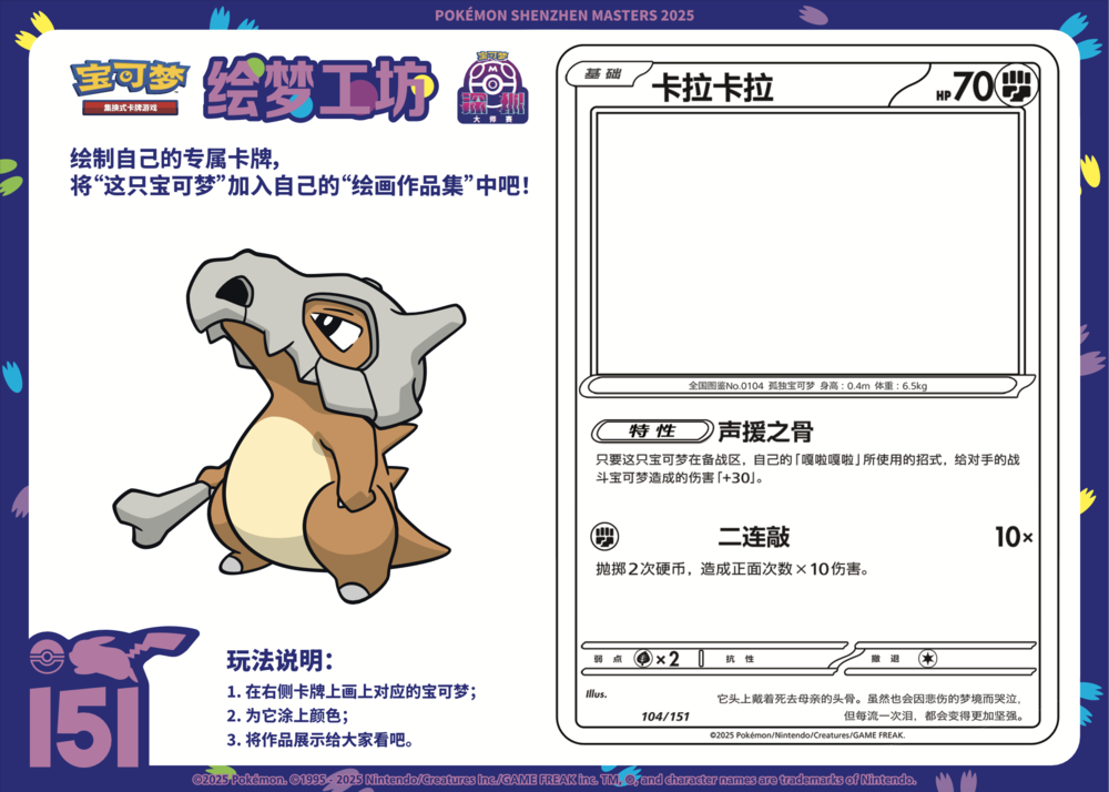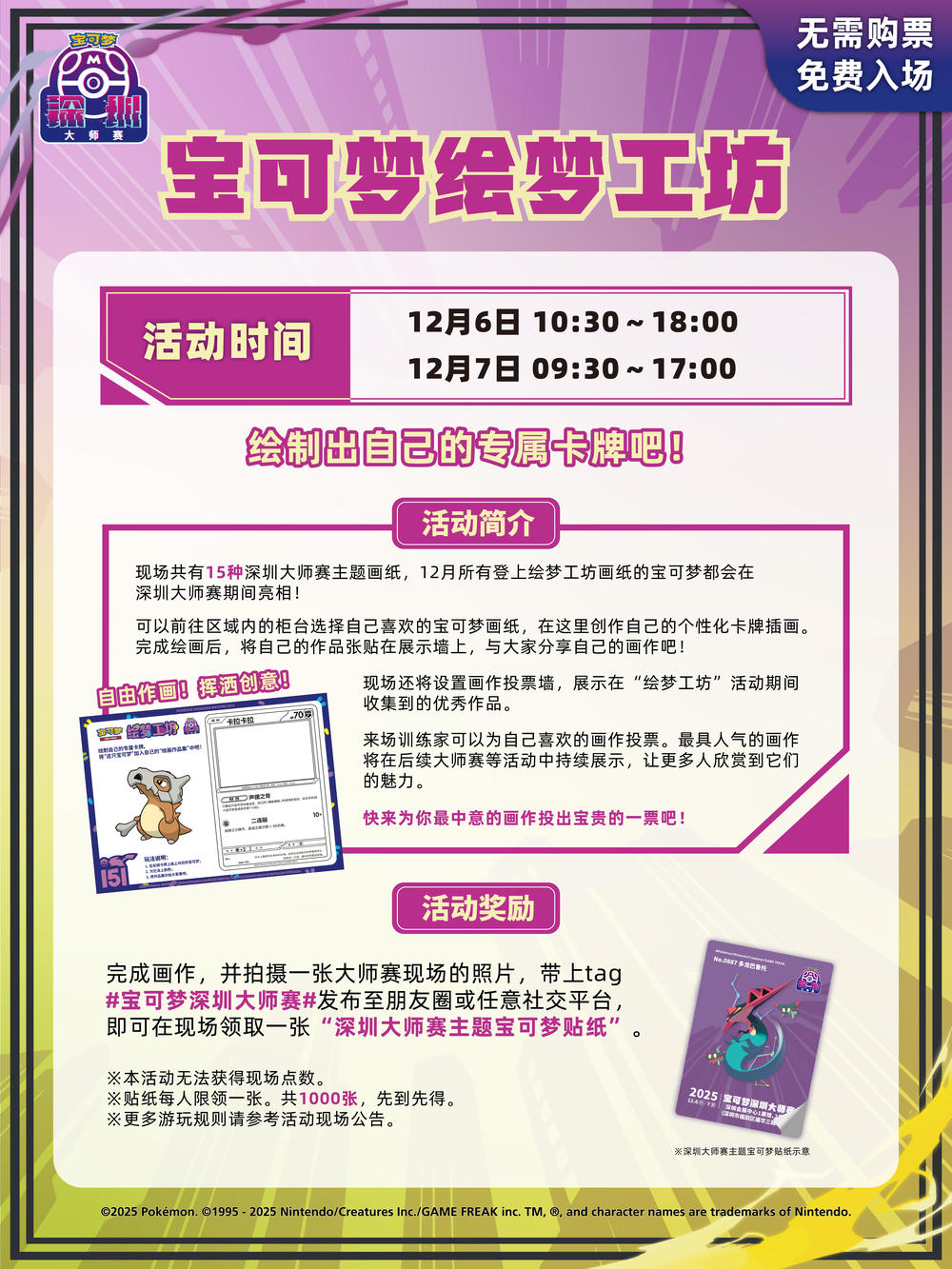 活动奖励:完成画作,并拍摄一张大师赛现场的照片,带上tag #宝可梦深圳大师赛#发布至朋友圈或任意社交平台,即可在现场领取一张“深圳大师赛主题宝可梦贴纸”。