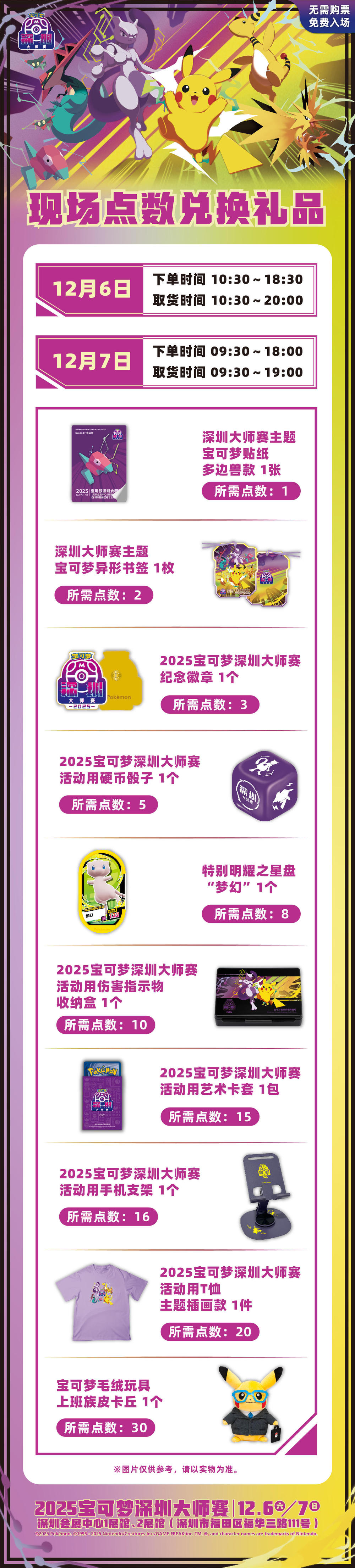参加大师赛现场的部分宝可梦嘉年华活动将有机会获得深圳大师赛现场点数,训练家可通过积累点数在现场兑换相应的礼品,更有深圳大师赛专属礼品等你来拿!