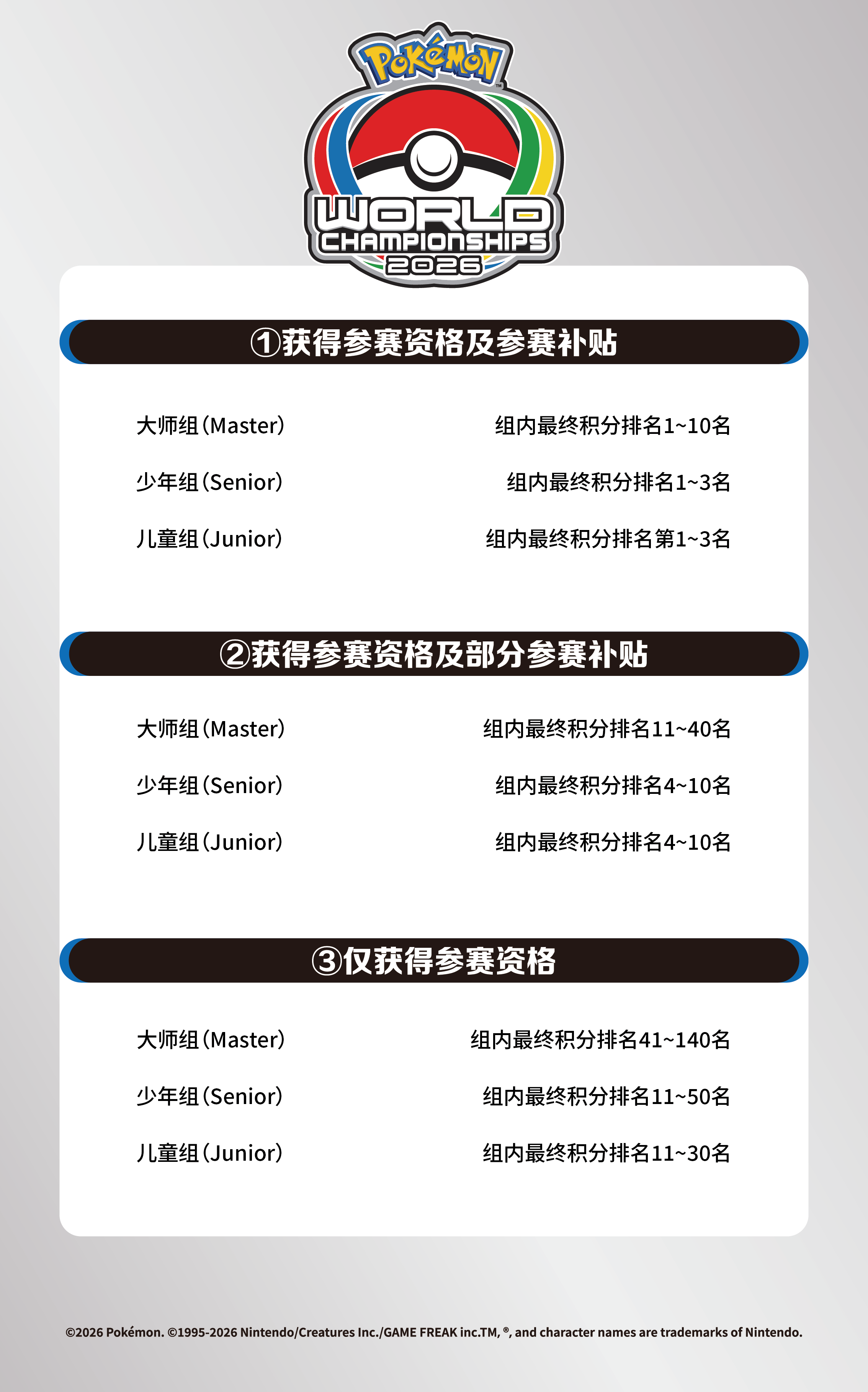 游玩宝可梦卡牌简体中文版的训练家获得参赛资格后方可参加本次2026世界锦标赛卡牌项目。参赛资格可通过在指定期间内获得的官方赛事积分达到指定排名来获得,分为以下三类: