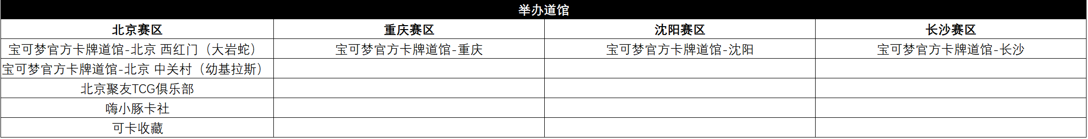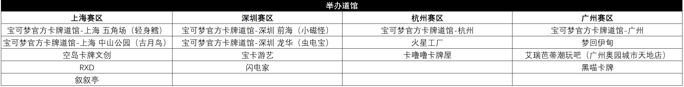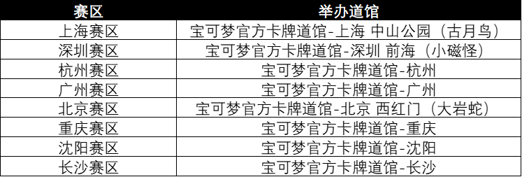 各赛区预赛排名前64名的训练家将进入正赛。各赛区正赛将在如下官方卡牌道馆举办。