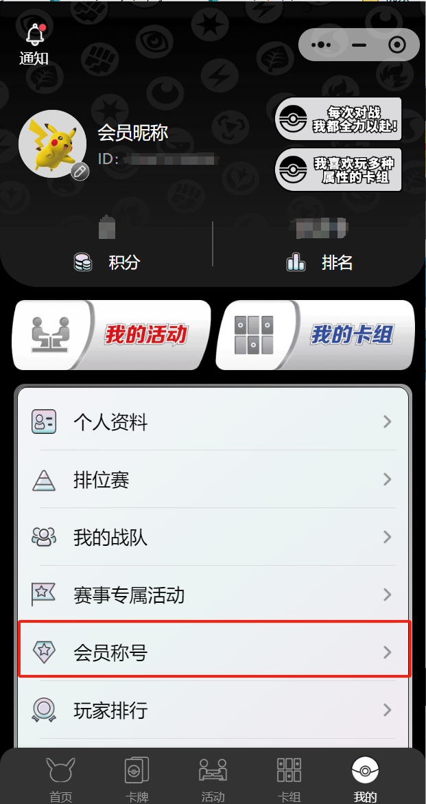 1. 进入宝可梦卡牌会员小程序,登录成功后点击“我的”,找到“会员称号”。