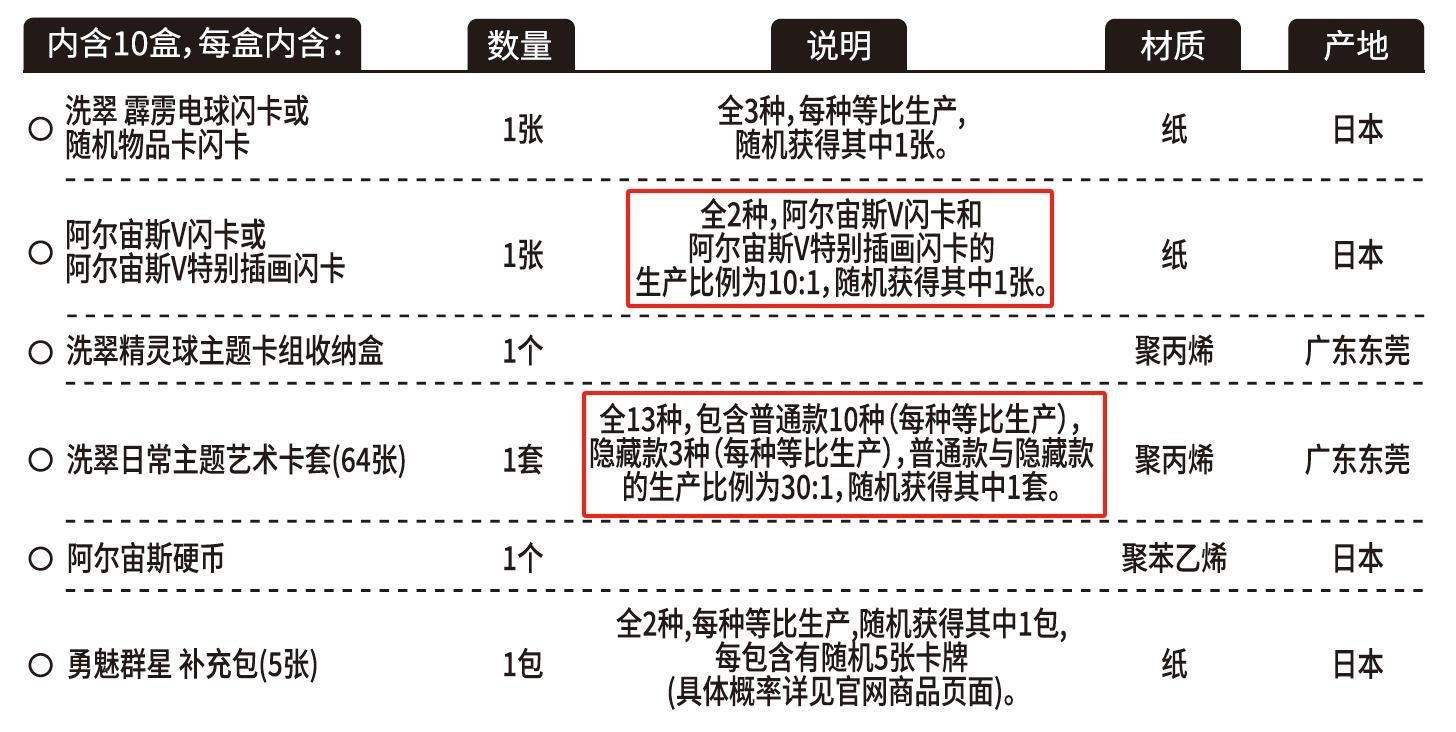 ·错误内容:阿尔宙斯V闪卡或阿尔宙斯V特别插画闪卡和洗翠日常主题艺术卡套的概率说明与实际不一致。(下图的红框标注处)