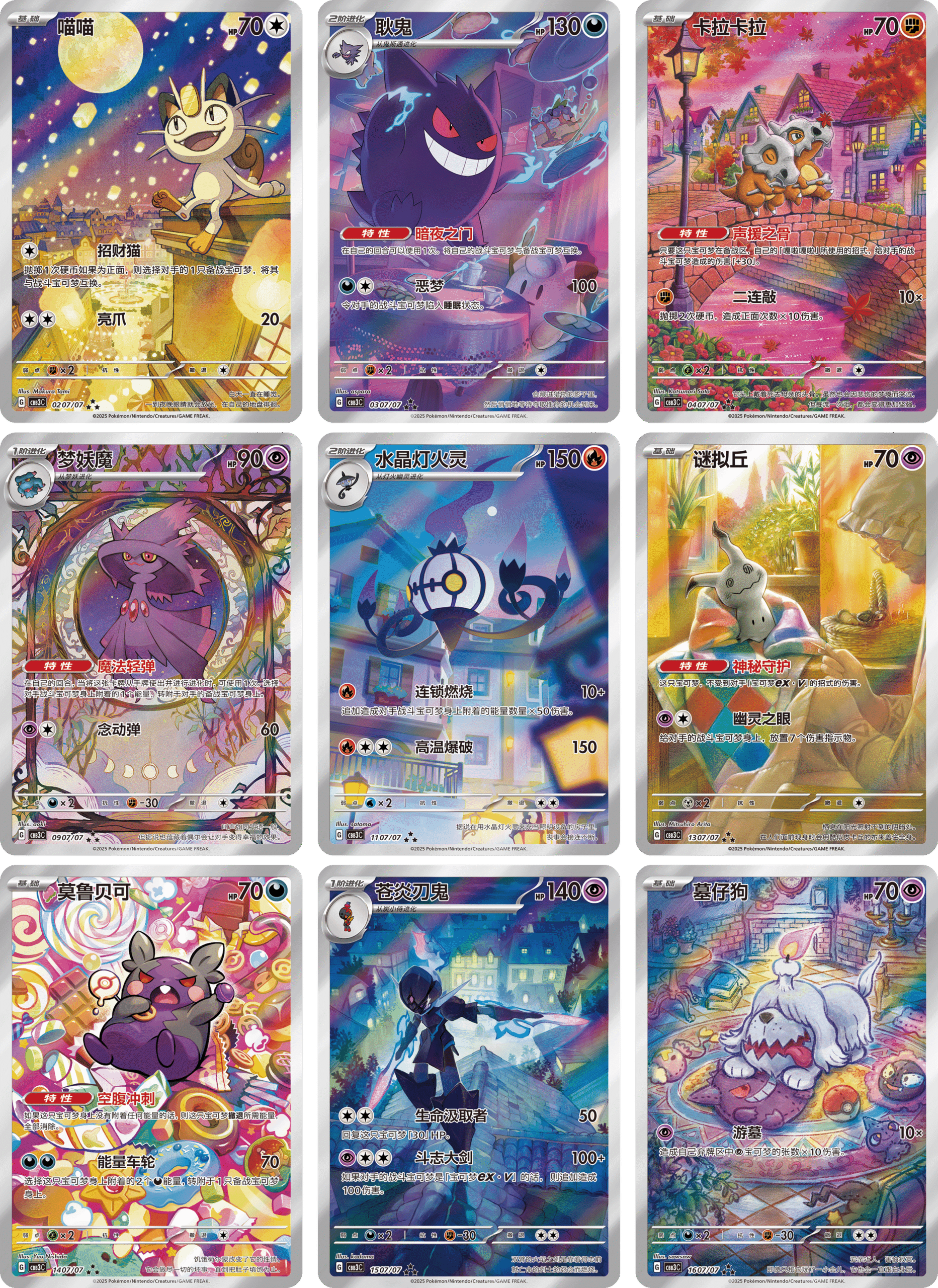 “Pokémon宝石包”第三弹中还收录了9种宝可梦艺术插画闪卡。奶油色般的月光下,喵喵正坐在屋顶上望向天空中划过的无数盏华灯。最喜欢耀眼发光物品的喵喵,一定很喜欢这样的场景吧。无人的客厅里,耿鬼正在对各种美味的点心使用招式。看它脸上得意的大笑,是在偷偷搞鬼吗?还是在帮助训练家预备第二天的美食呢?