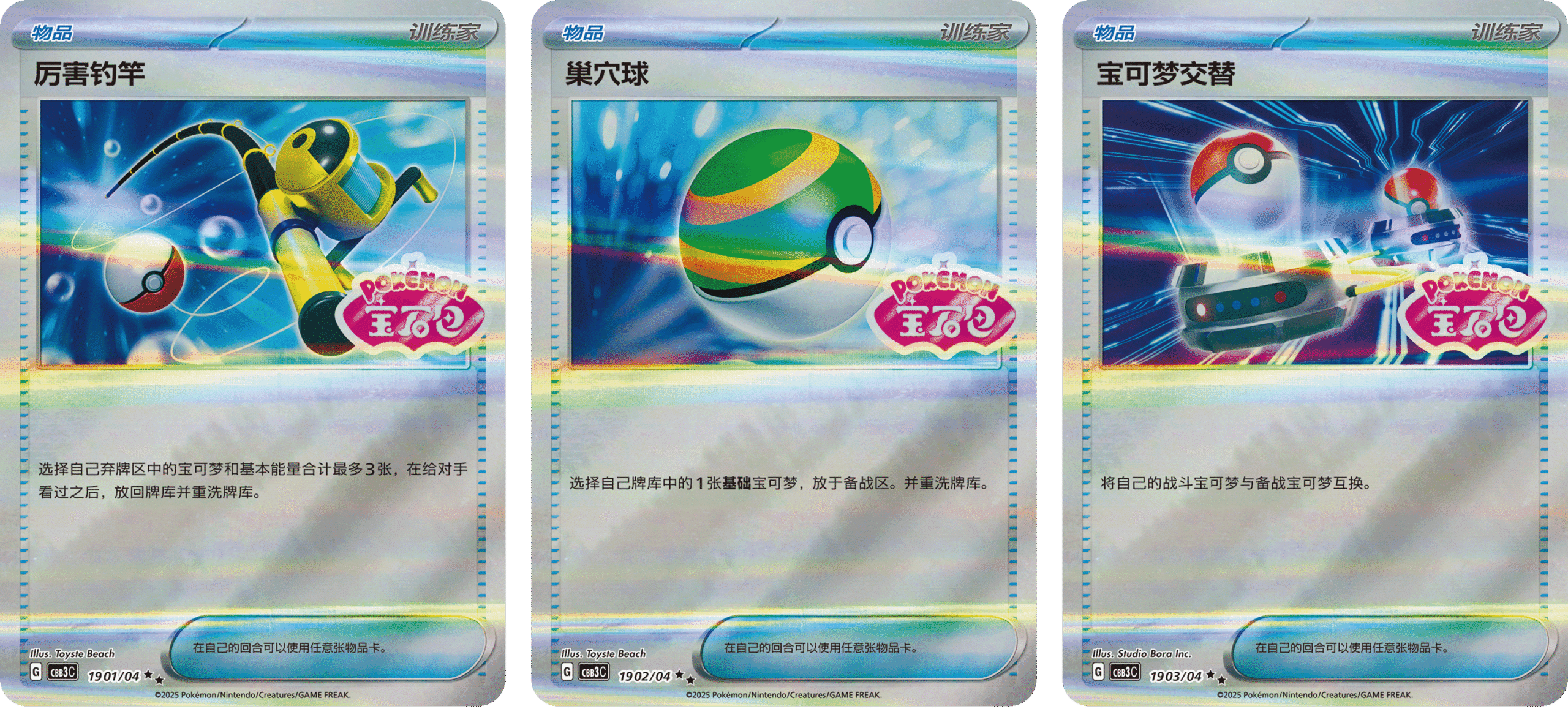 除了宝可梦闪卡,卡包中还收录了训练家闪卡和能量闪卡。训练家闪卡包括物品卡“厉害钓竿”“巢穴球”和“宝可梦交替”,以及支援者卡“派帕”。