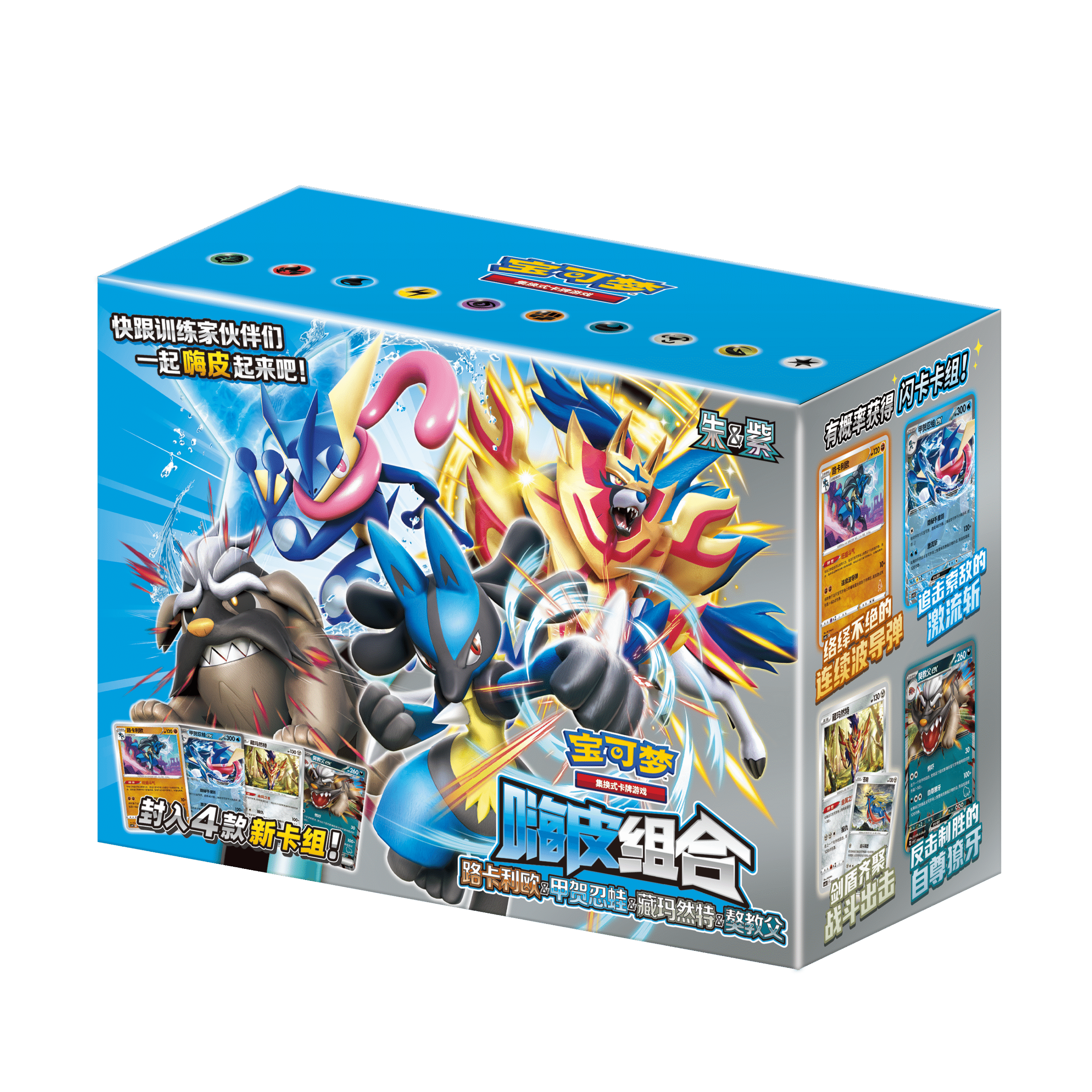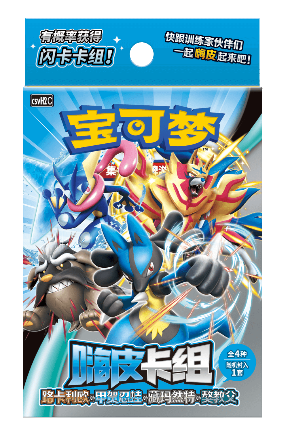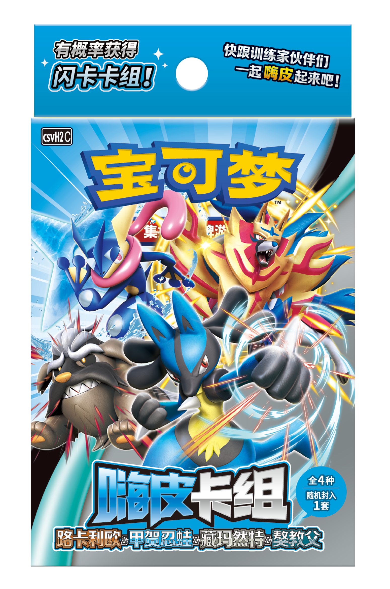 ※随机封入路卡利欧、甲贺忍蛙、藏玛然特、獒教父卡组其中1组的“嗨皮卡组”也将同步发售,建议零售价20元/盒。