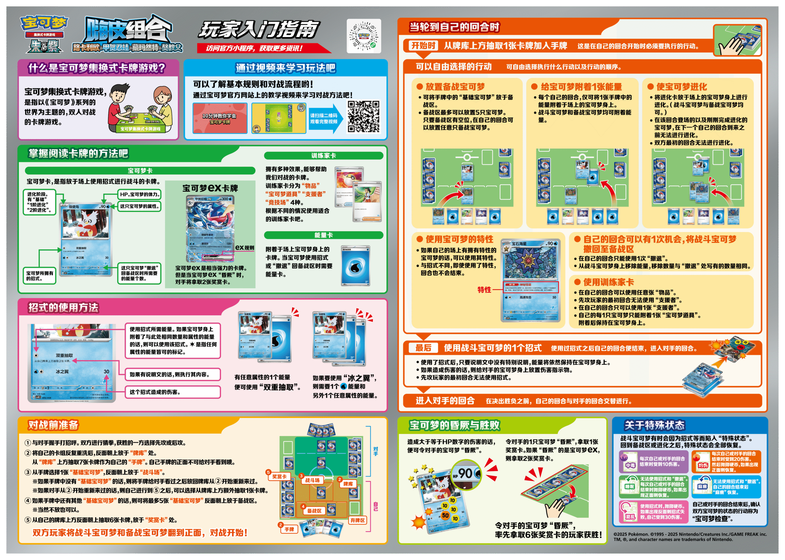 为了方便第一次游玩宝可梦卡牌的训练家,商品内还含有1张玩家入门指南和2份对战指南,简洁易懂地介绍了宝可梦卡牌对战的玩法规则和操作步骤。包装内还配有伤害指示物和硬币等对战所需用品。和好友们开始一场宝可梦卡牌对战吧。
