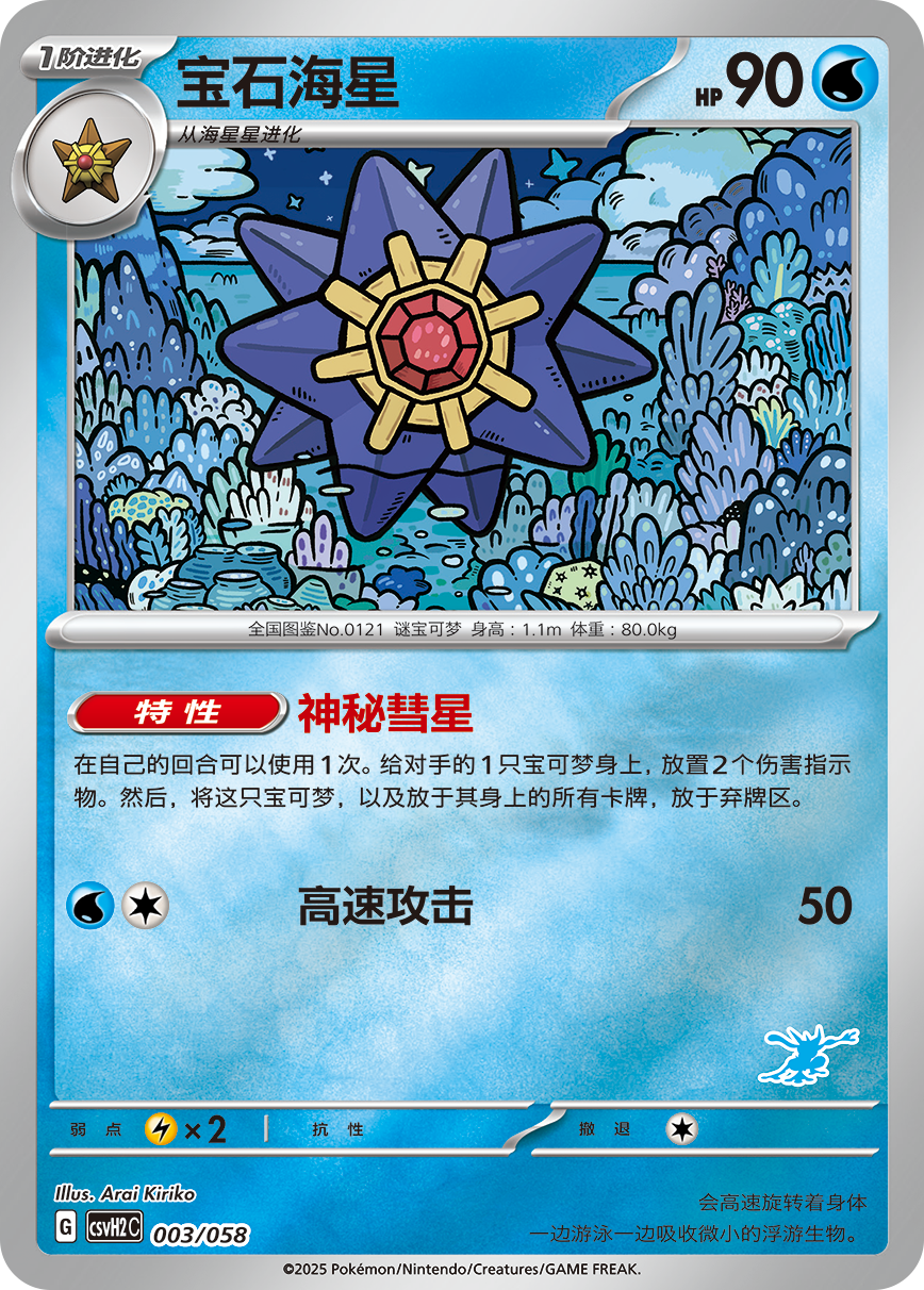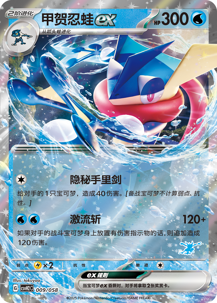 甲贺忍蛙卡组的进攻核心甲贺忍蛙ex作为2阶进化宝可梦,拥有300HP。其招式“激流斩”十分强力,如果对手战斗宝可梦身上放有伤害指示物,就可以造成高额的伤害。灵活使用宝石海星的特性“神秘彗星”,给对手的战斗宝可梦身上放置伤害指示物,让甲贺忍蛙ex打出更高伤害吧!