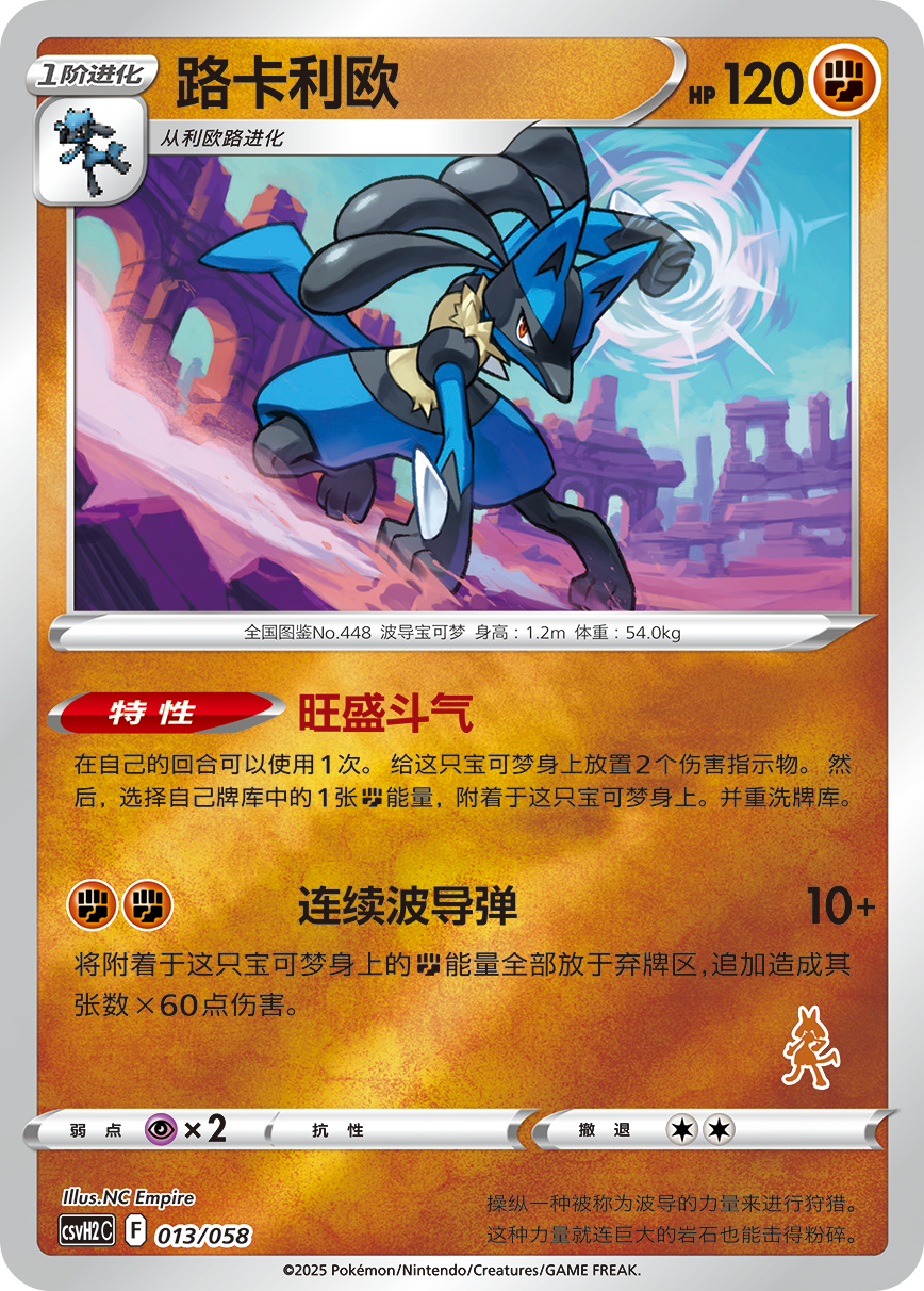 招式“连续波导弹”是路卡利欧卡组的进攻核心。附着于路卡利欧身上的斗能量数量越多,“连续波导弹”能够造成的伤害就越高。活用路卡利欧的特性“旺盛斗气”附着更多的斗能量来一击昏厥对手的宝可梦。如果路卡利欧损失了过多的HP,就使用物品卡“伤药”来回复HP。