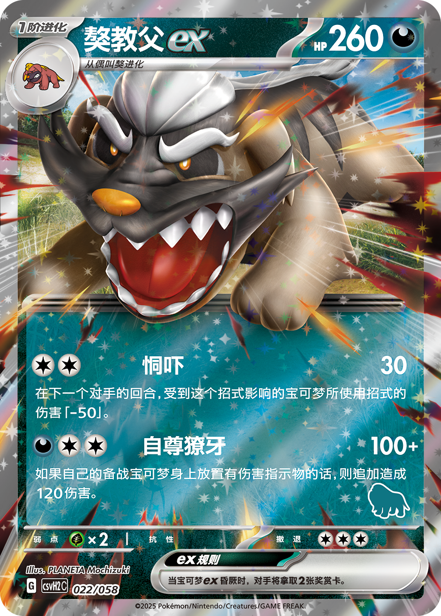 獒教父卡组的进攻核心是可攻可守的獒教父ex。獒教父ex的招式“恫吓”可以降低对手造成的伤害。活用嘟嘟利的特性“暴走抽取”,不仅可以在放置伤害指示物的同时补充手牌,还可以让獒教父ex的招式“自尊獠牙”给对手造成更高的伤害!