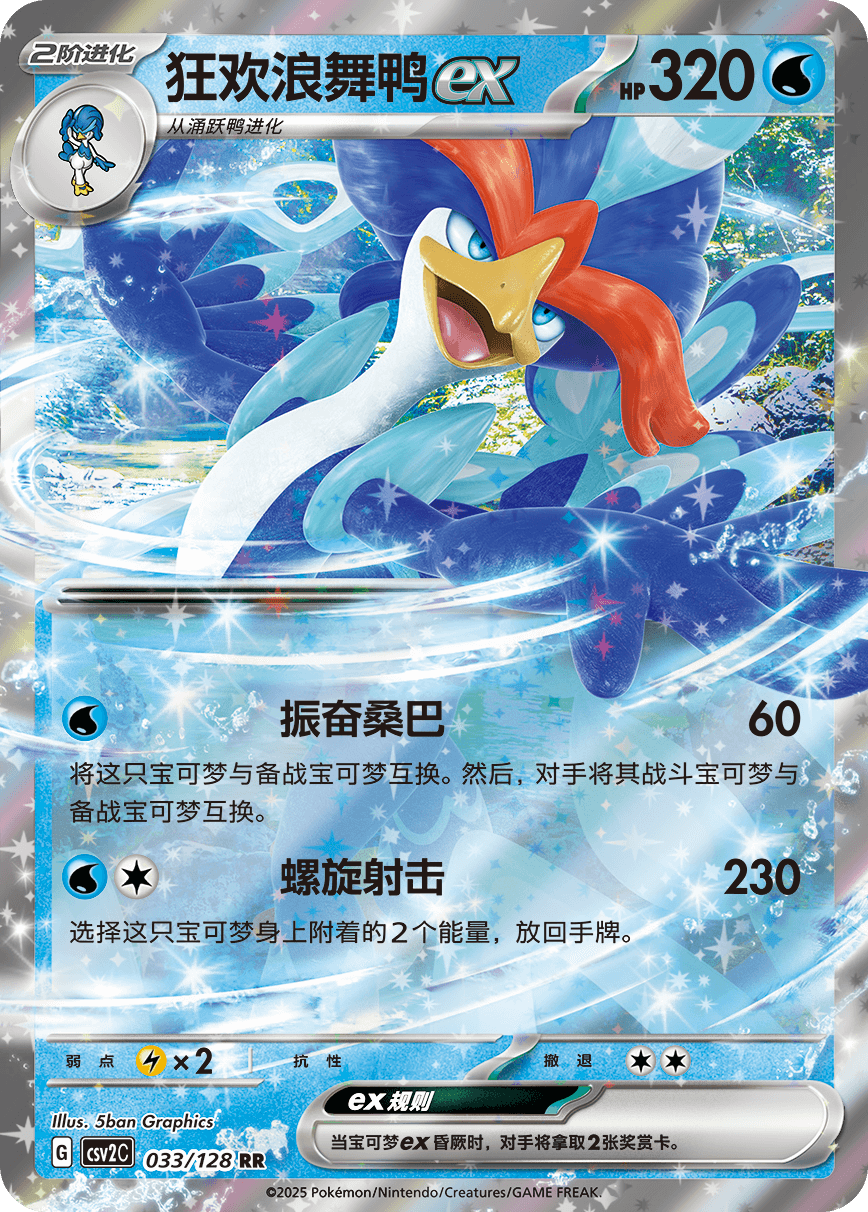 狂欢浪舞鸭ex的招式“螺旋射击”,需要1个水能量和1个任意属性能量,可以给对手的战斗宝可梦造成230点伤害。