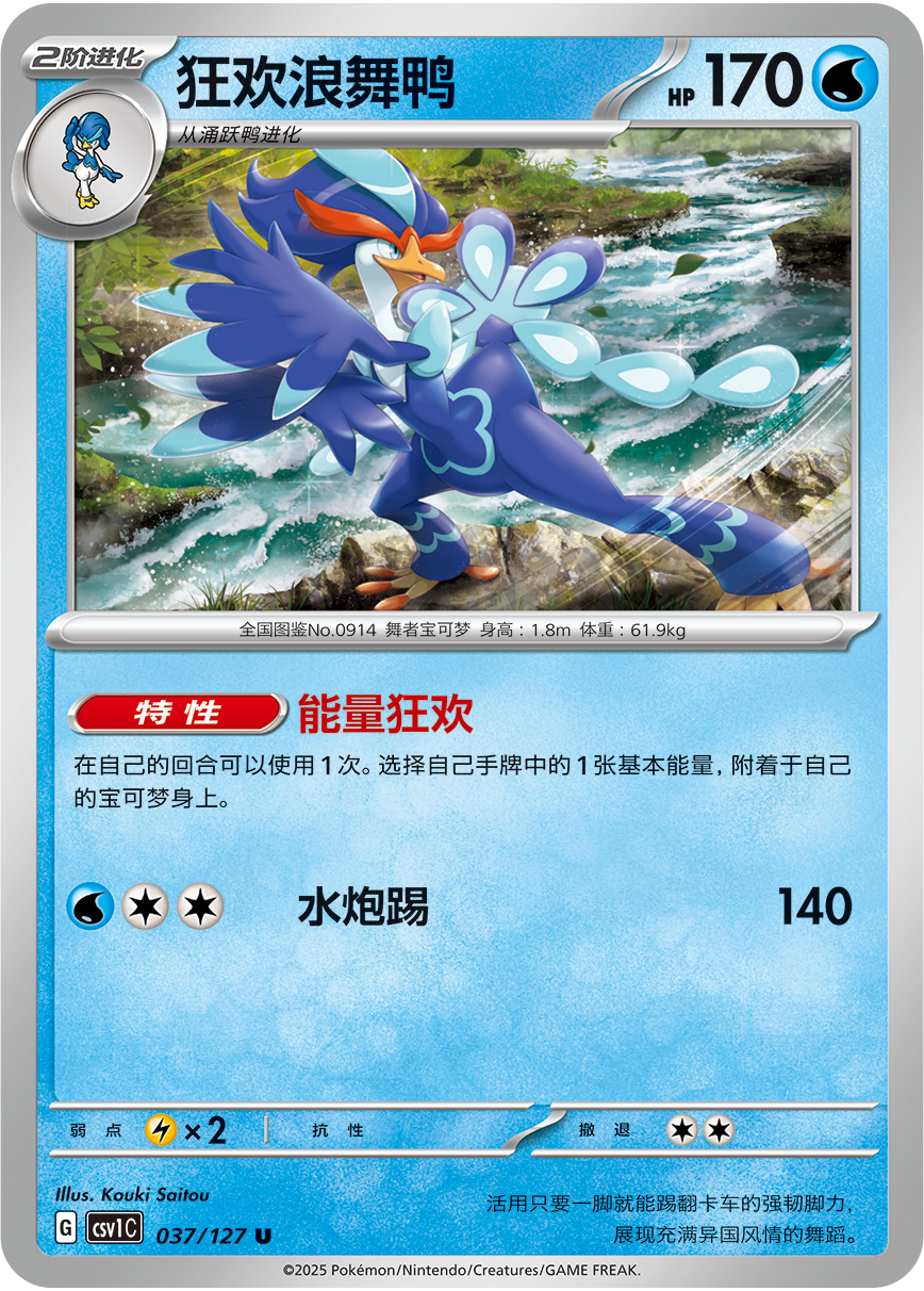 通过从手牌附着能量以及配合收录于“亘古开来”中的“狂欢浪舞鸭”的特性“能量狂欢”,就可以在每回合稳定使用“螺旋射击”,持续造成高额伤害。