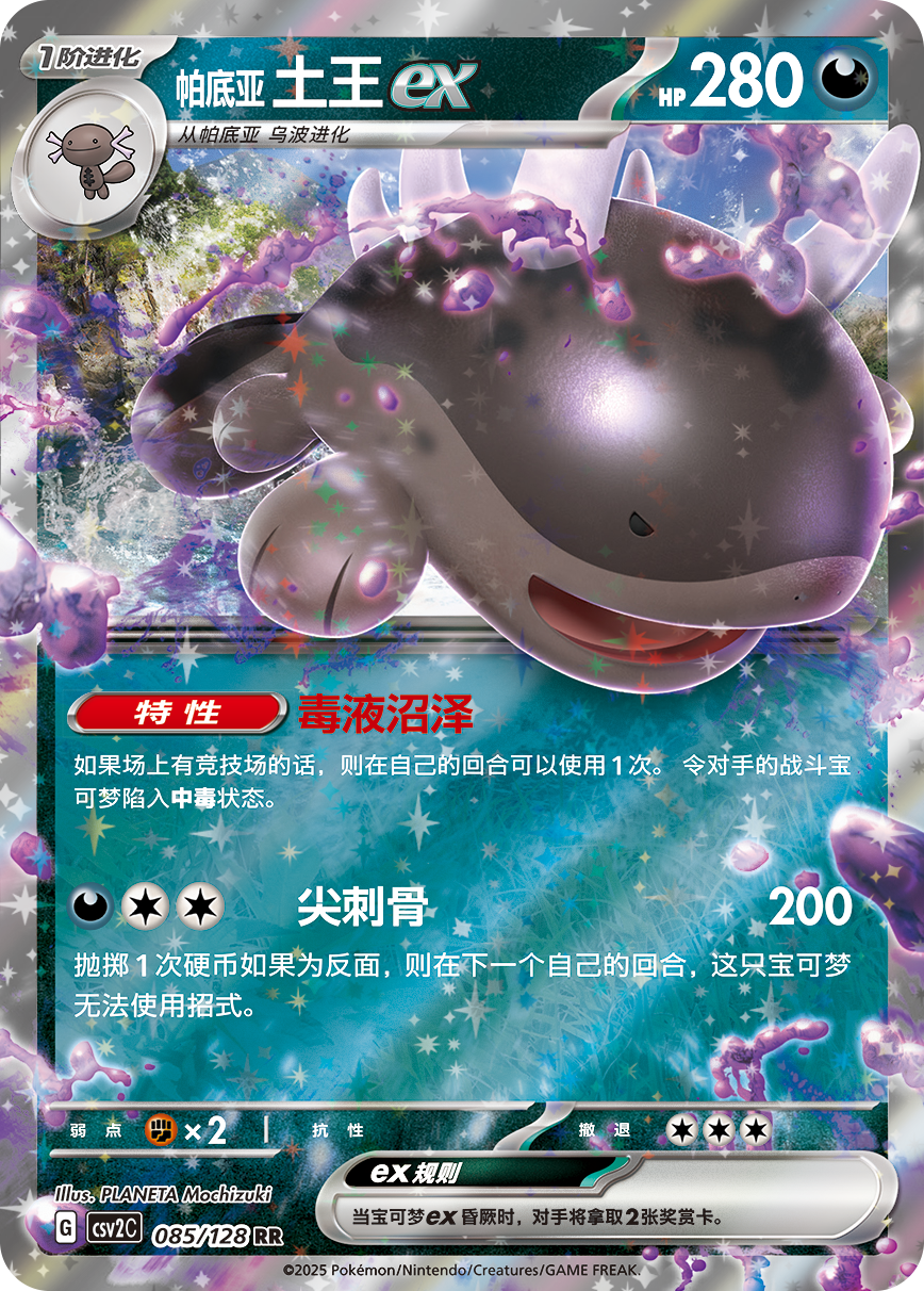帕底亚 土王ex的特性“毒液沼泽”在场上有竞技场的情况下在自己的回合可以使用1次,令对手的战斗宝可梦陷入中毒状态。招式“尖刺骨”则可以给对手的战斗宝可梦造成200点伤害。