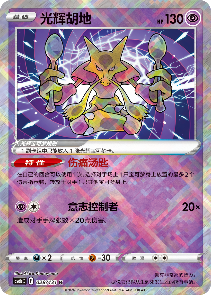 配合收录于补充包“碧海暗影”中的光辉胡地的特性“伤痛汤匙”,给对手的战斗宝可梦身上转放伤害指示物,就有机会造成220点高额伤害。