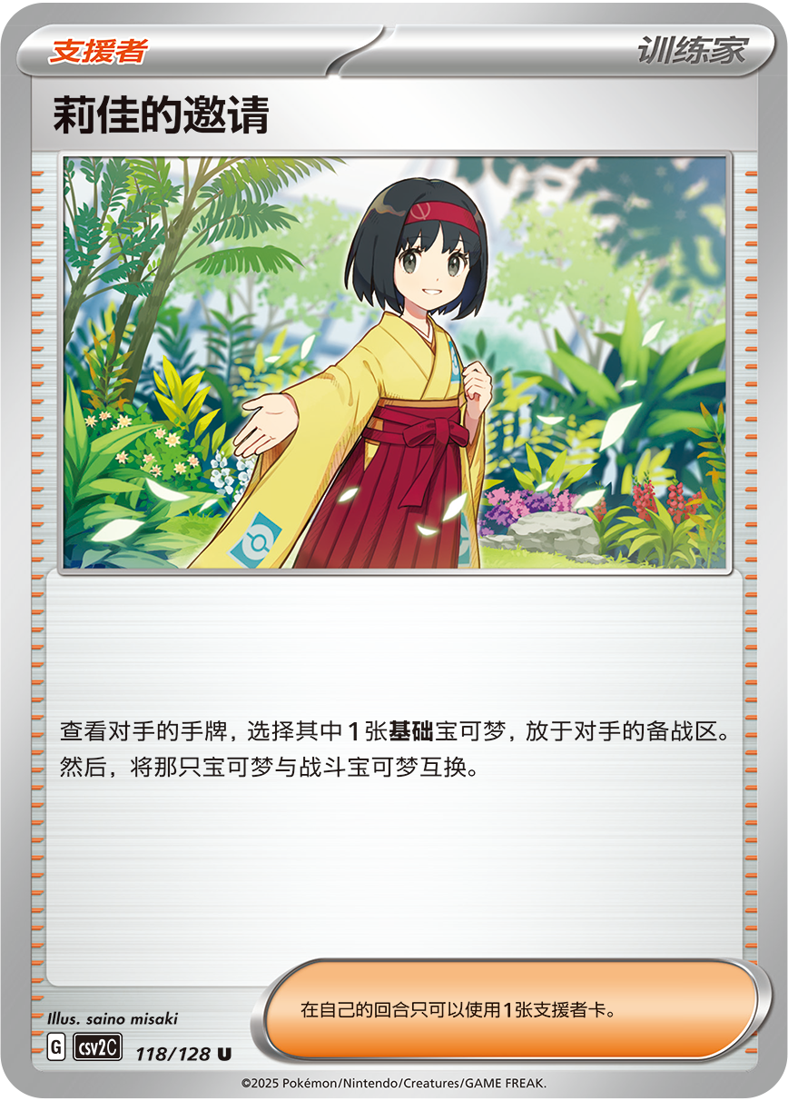 支援者“莉佳的邀请”可以查看对手的手牌,选择其中1张基础宝可梦强制放于对手的备战区,并且将其与战斗宝可梦互换。这样不但可以令对手暂不打算放置的宝可梦强制上场,还能换下他的战斗宝可梦,打乱其进攻节奏。