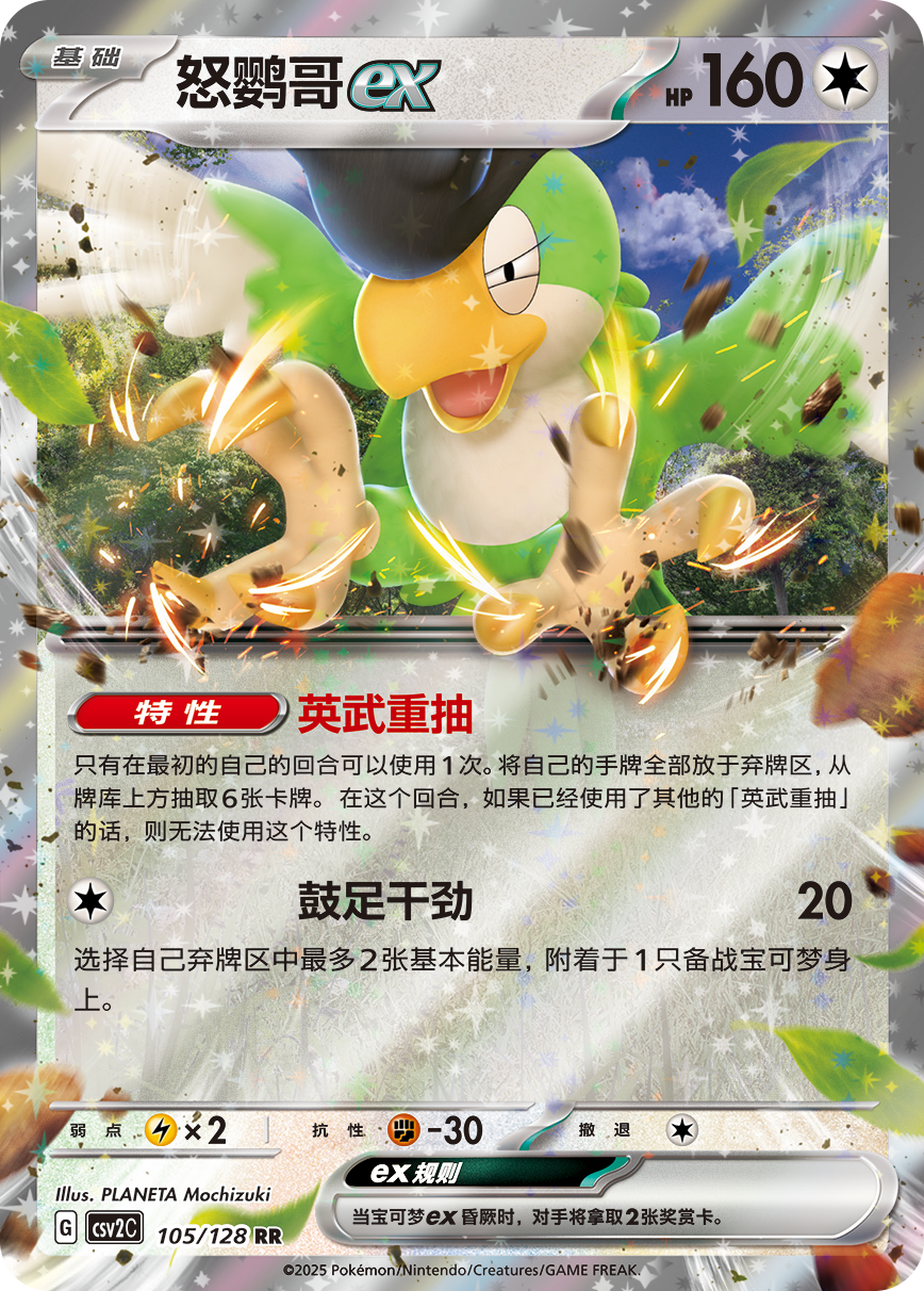 怒鹦哥ex的特性“英武重抽”可以帮助训练家在自己的最初回合手牌不理想时弃置全部手牌并从牌库上方重新抽取6张。且由于该特性并非在将怒鹦哥ex放于备战区时就必须使用,因此可以在使用完手牌中的有用资源后再使用该特性。