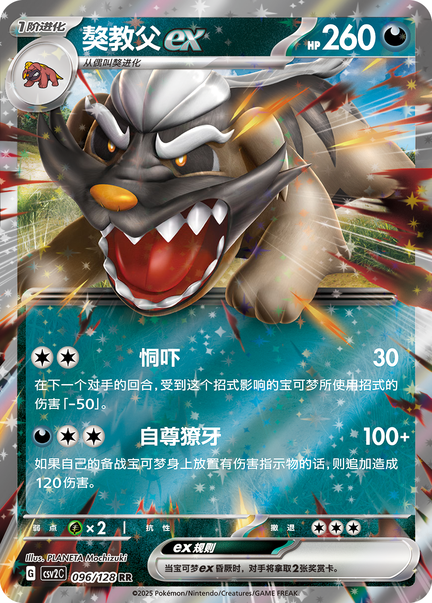 獒教父ex的招式“自尊獠牙”可以给对手造成100点基础伤害,且若自己的备战宝可梦身上放有伤害指示物的话,可追加造成120点伤害。