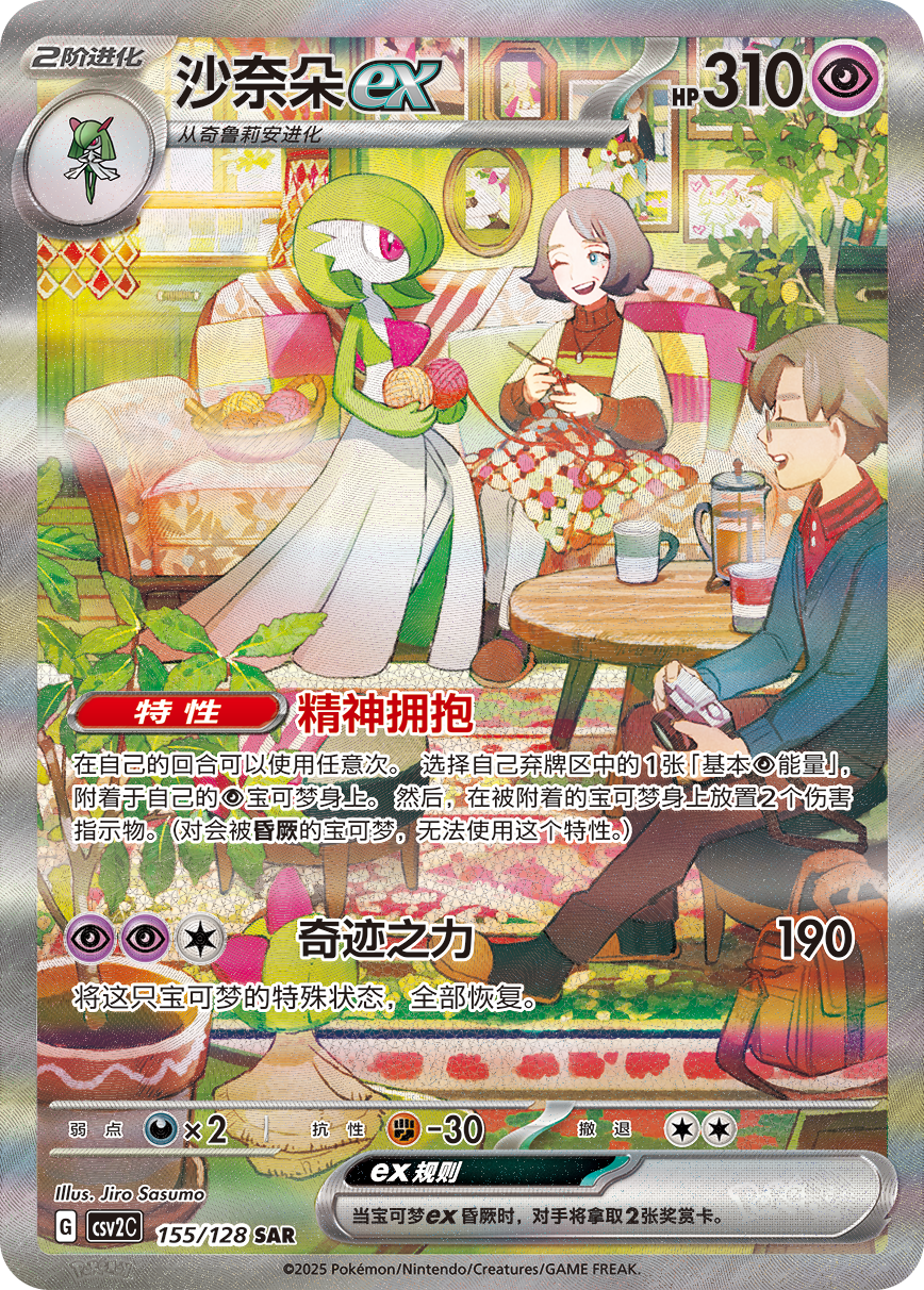 沙奈朵ex的招式“奇迹之力”不仅可以造成190点伤害,还可以恢复这只宝可梦的全部特殊状态。沙奈朵ex的特性同样无法小觑,“精神拥抱”可选择自己弃牌区中的1张基本超能量,附着于自己的超属性宝可梦身上,然后在那只宝可梦身上放置2个伤害指示物。并且这个特性在自己的回合可以使用任意次。
