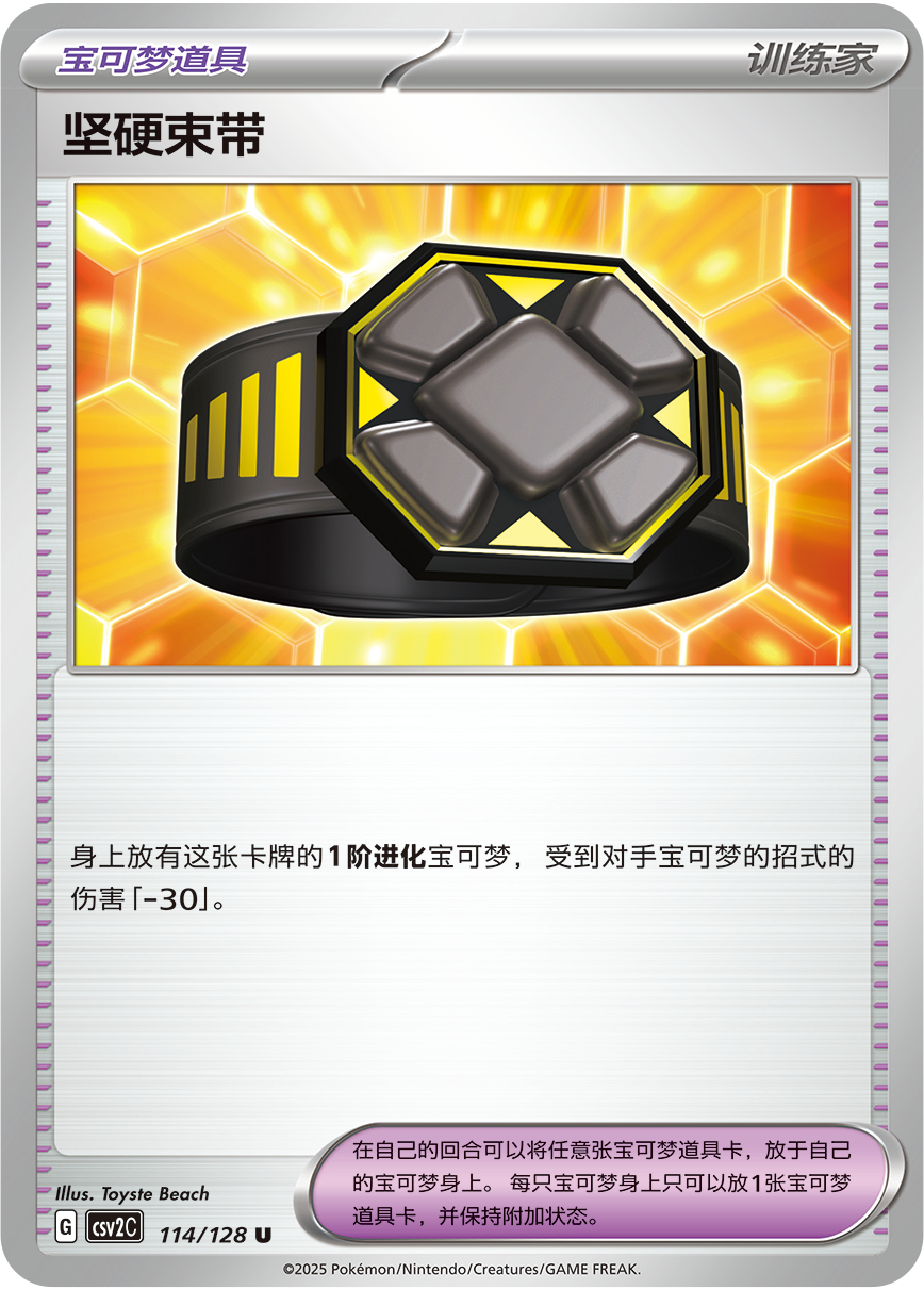 附着了宝可梦道具“坚硬束带”的1阶进化宝可梦,受到对手宝可梦的招式伤害-30。