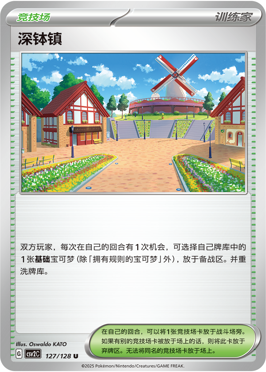 竞技场“深钵镇”可以让双方玩家在自己的回合将牌库中的1张除拥有规则的宝可梦外的基础宝可梦直接放于备战区。在对战的前期快速铺场,为后面的攻势做准备。