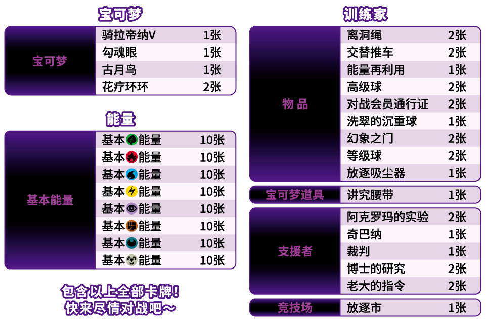 “放逐区“构筑常用的宝可梦卡、训练家卡以及能量卡加持