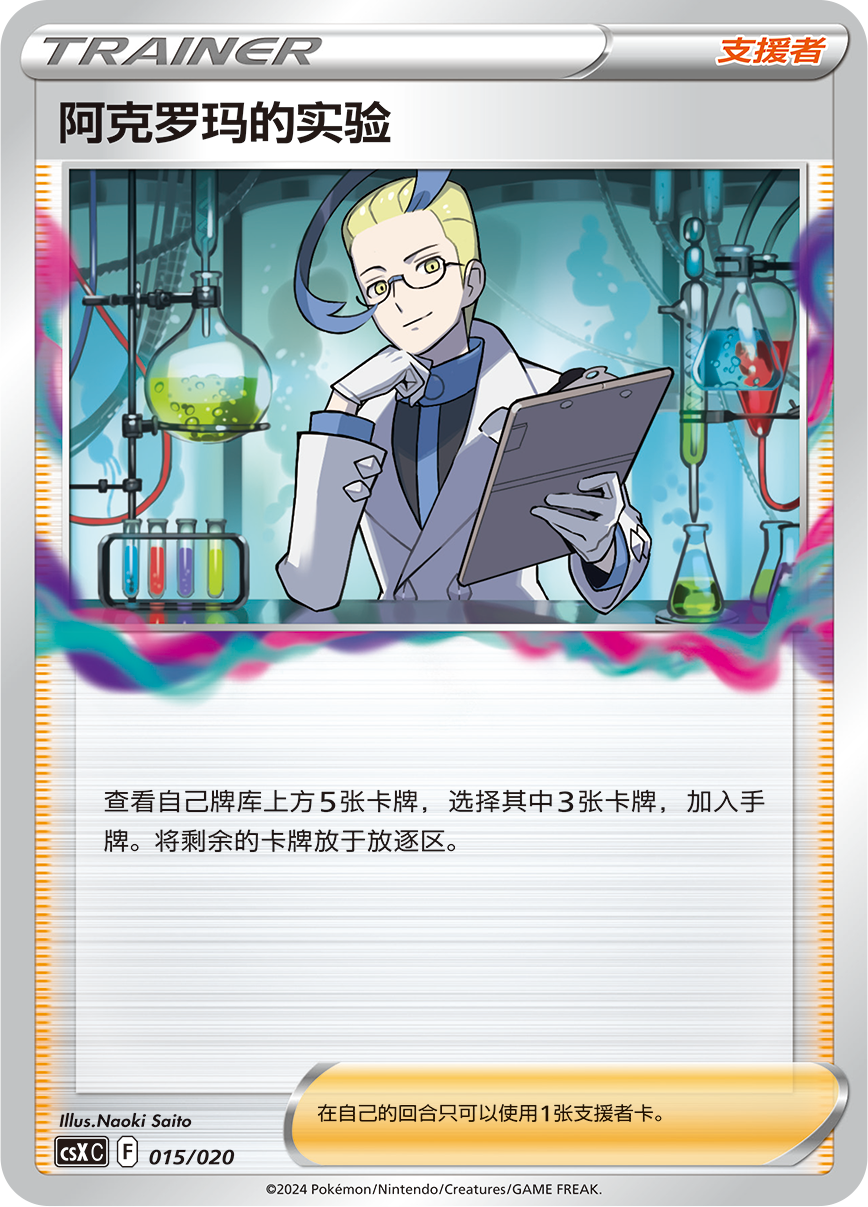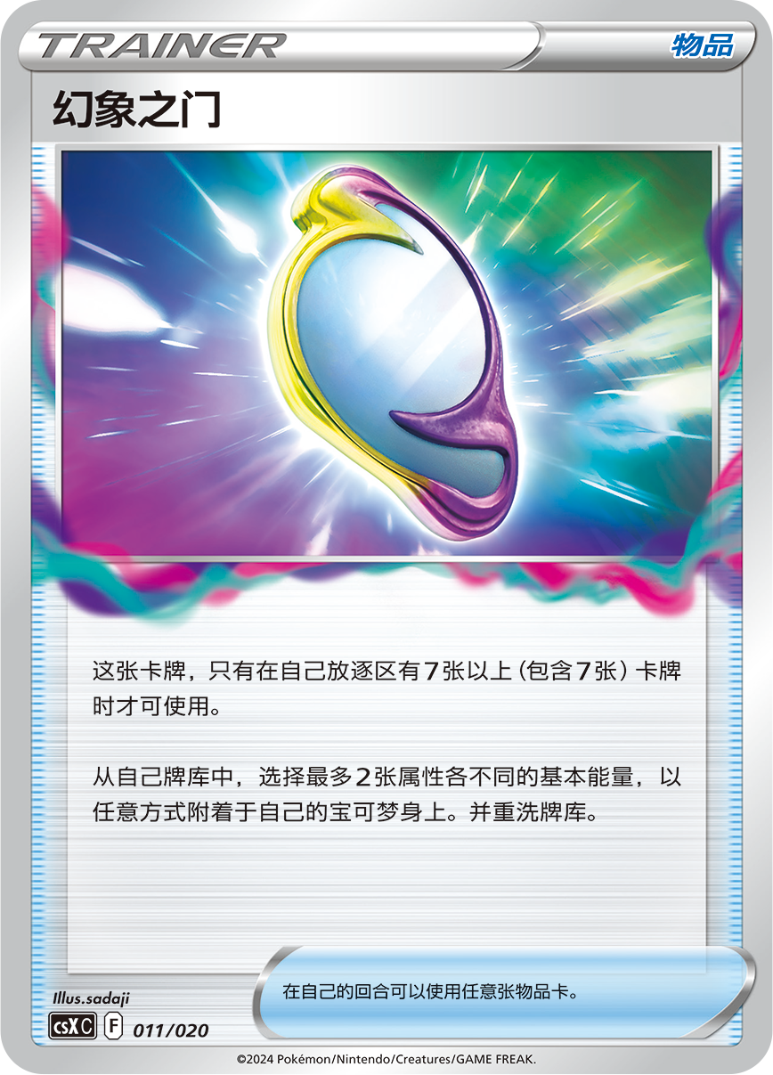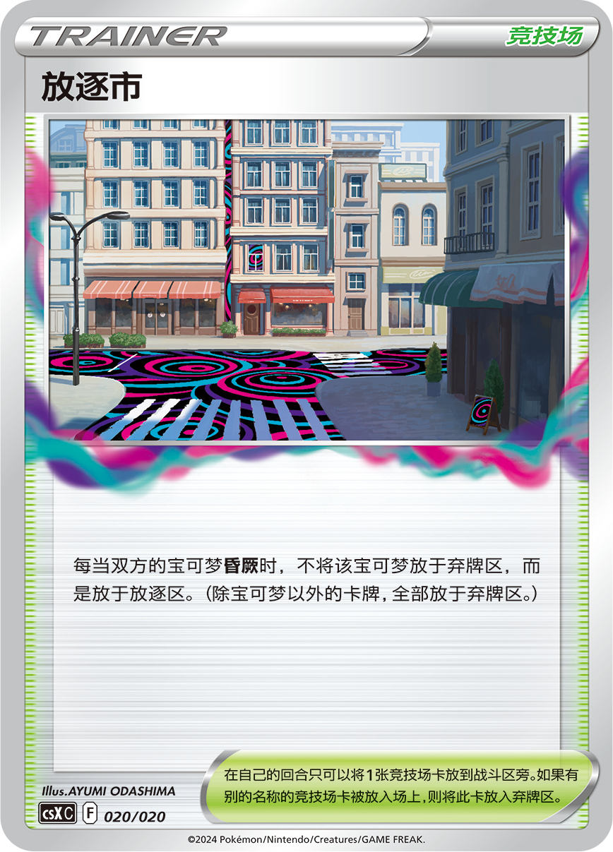 比如可以查看牌库上方5张卡牌,将其中2张放于放逐区的支援者卡“阿克罗玛的实验”。通过将自己的一张手牌放于放逐区后能将双方场上宝可梦身上的“宝可梦道具”或场上“竞技场”中的1张放于放逐区的物品卡“放逐吸尘器”。抑或是只有在自己的放逐区有7张或以上卡牌时才能使用其效果的物品卡“幻象之门”。以及只有在自己的放逐区有10张或以上卡牌才能使用招式“星耀安魂曲”的“骑拉帝纳VSTAR等。这些卡牌的组合令围绕“放逐区”构筑的卡组拥有各种可能。