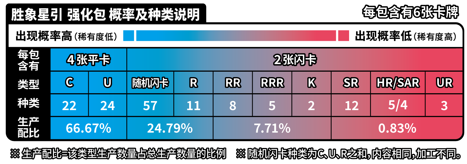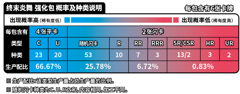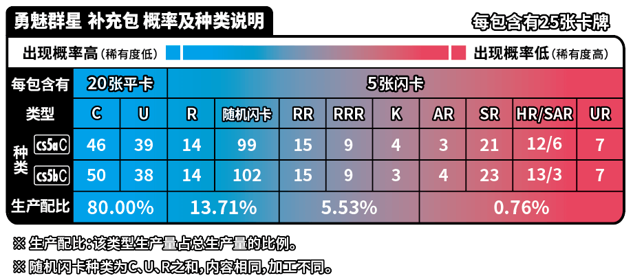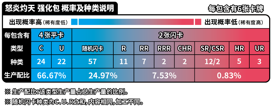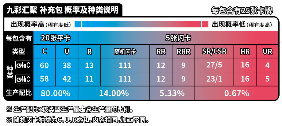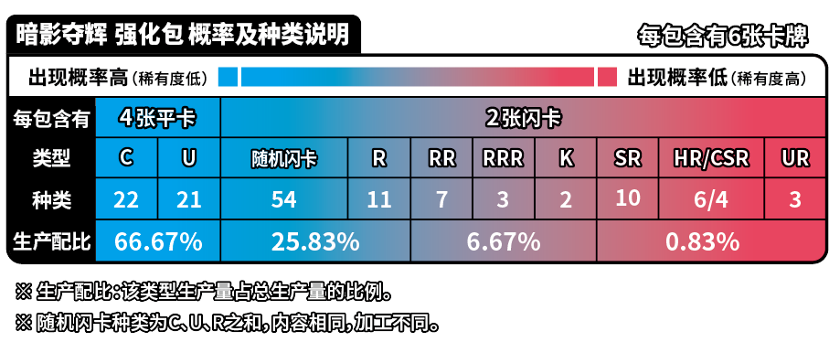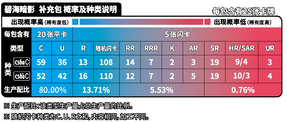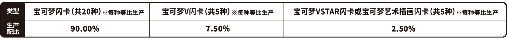 | 商品内容 | 1.宝可梦闪卡、宝可梦V闪卡、宝可梦VSTAR闪卡或宝可梦艺术插画闪卡 随机1张(其中宝可梦闪卡共20种,每种等比生产;宝可梦V闪卡共5种,每种等比生产;宝可梦VSTAR闪卡或宝可梦艺术插画闪卡共5种,每种等比生产) 2.与宝可梦卡对应的主题伤害指示物收纳盒 3.能量闪卡或训练家闪卡 随机1张 (能量闪卡共10种,训练家闪卡共28种,全38种,每种等比生产) 4.25张装补充包“洪荒演武”“九彩汇聚”“勇魅群星”“碧海暗影”随机1包 5.强化包“怒炎灼天”“终末炎舞”“暗影夺辉”“胜象星引”随机1包 |
