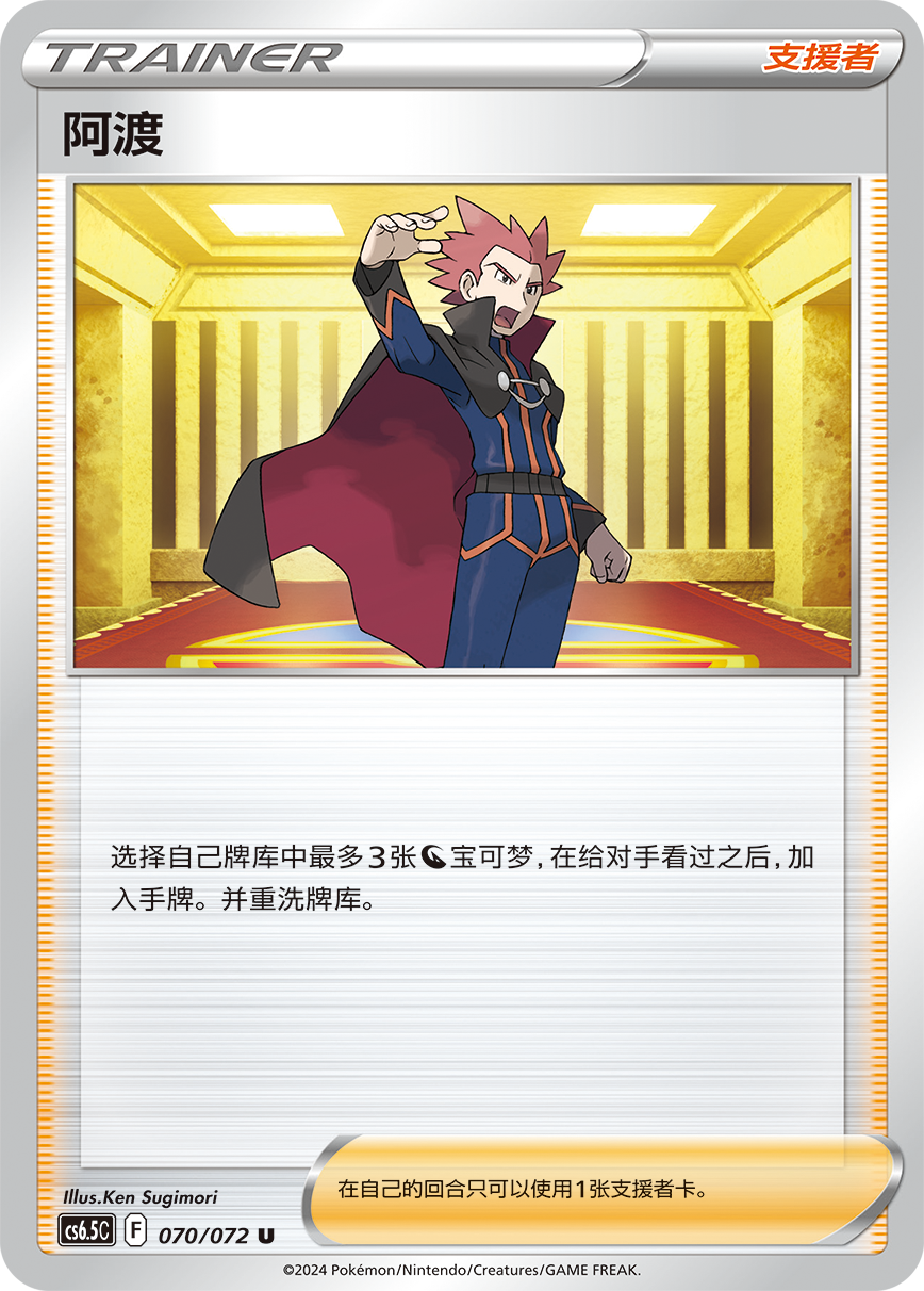 支援者卡“阿渡”的效果为选择自己牌库中最多3张龙属性宝可梦,在给对手看过之后加入手牌。配合高级球等可以将手牌放于弃牌区的卡牌,可以为使用雷吉铎拉戈VSTAR的招式“巨龙无双”做好准备。