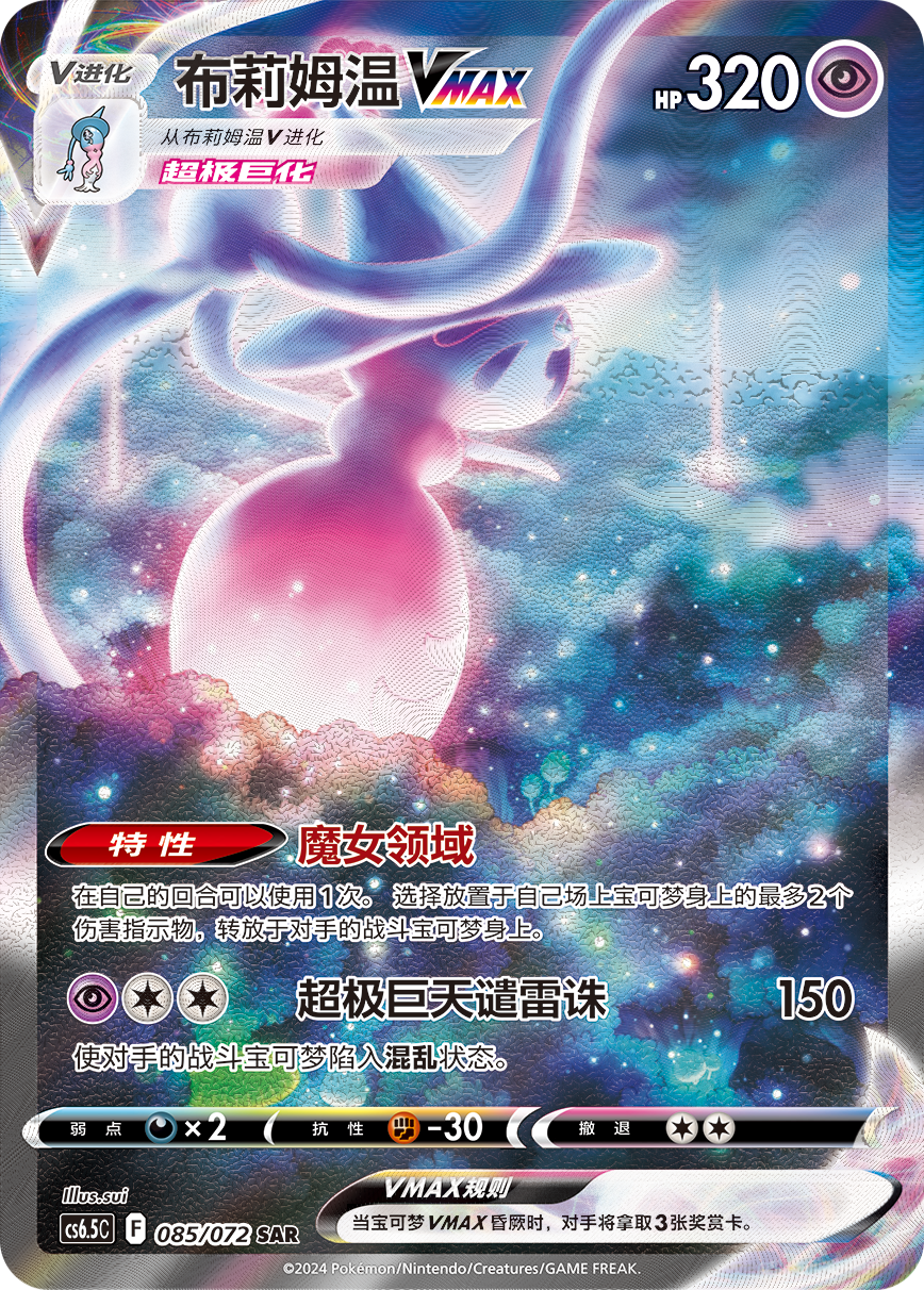 布莉姆温VMAX由布莉姆温V进化而来,其特性“魔女领域”可以选择放置于自己场上宝可梦身上的最多2个伤害指示物,转放于对手的战斗宝可梦身上。