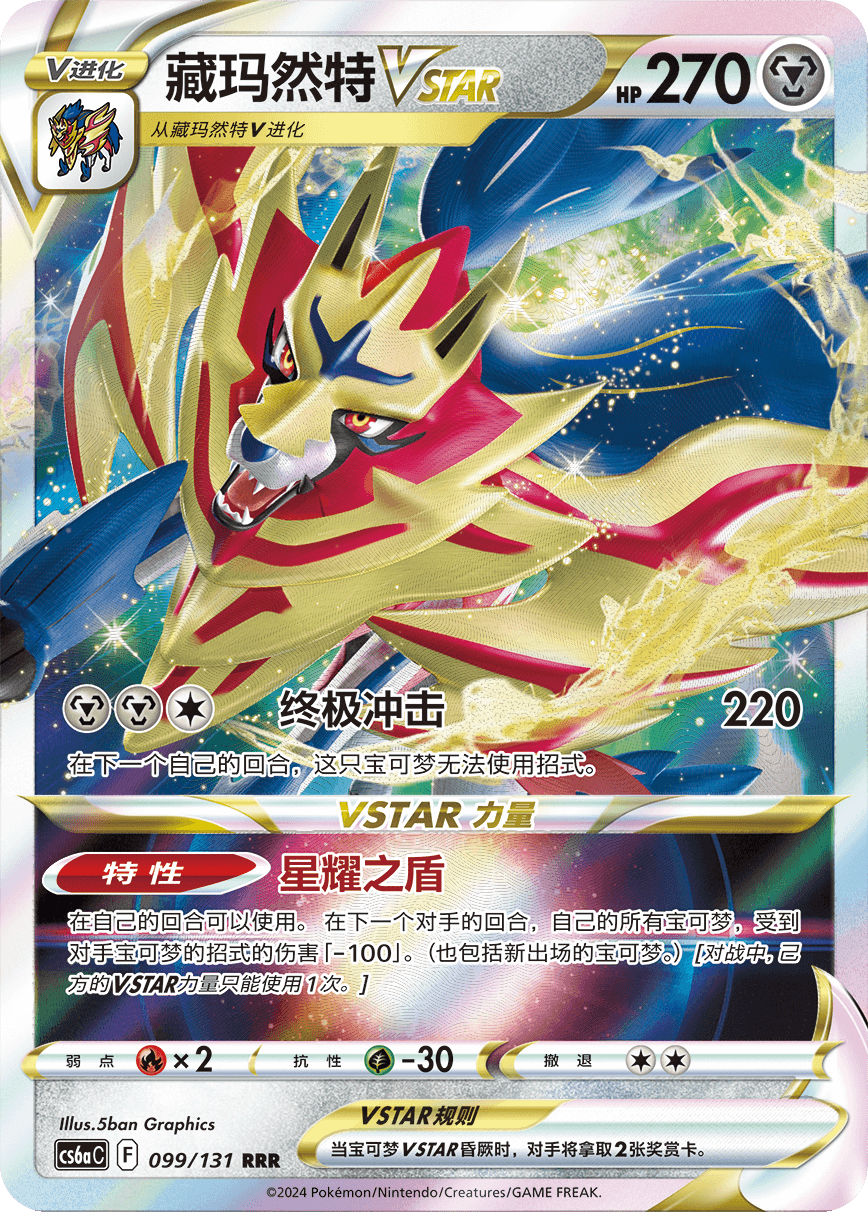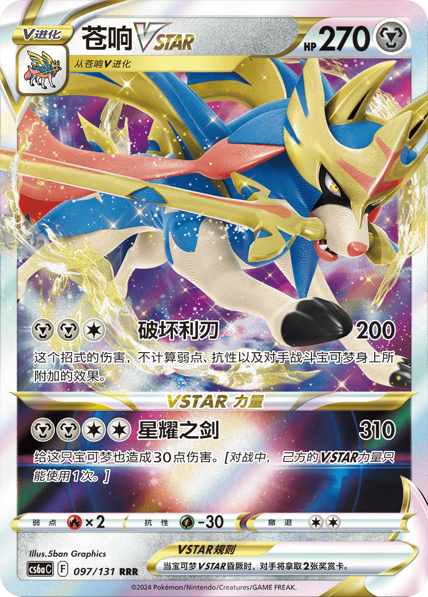 苍响VSTAR的VSTAR力量“星耀之剑”可以造成310的伤害。虽然自己也会受到30点伤害,但是配合道具卡“讲究腰带”和光辉摔角鹰人,甚至可以给对方的宝可梦VMAX造成370点伤害,威力巨大。