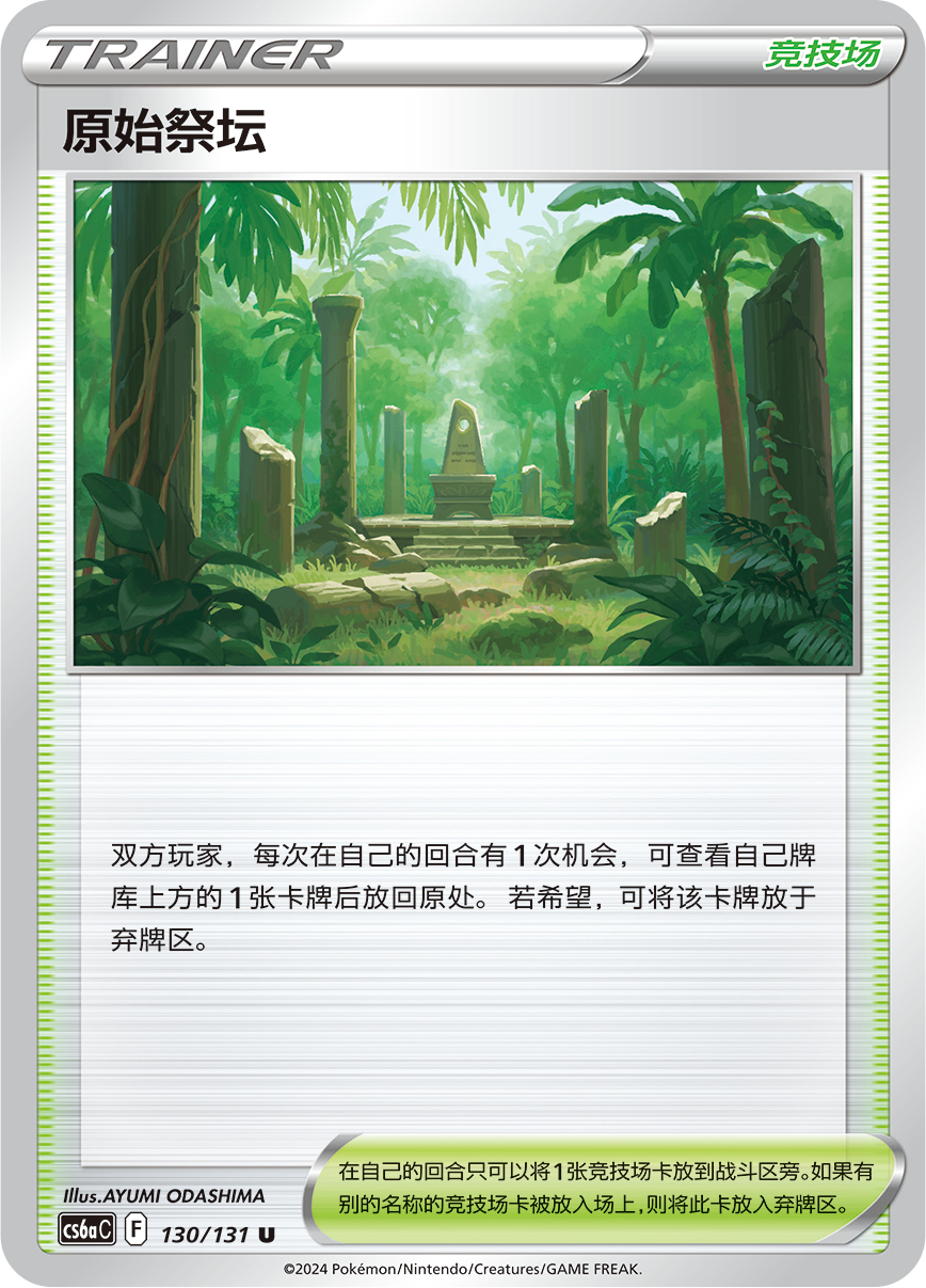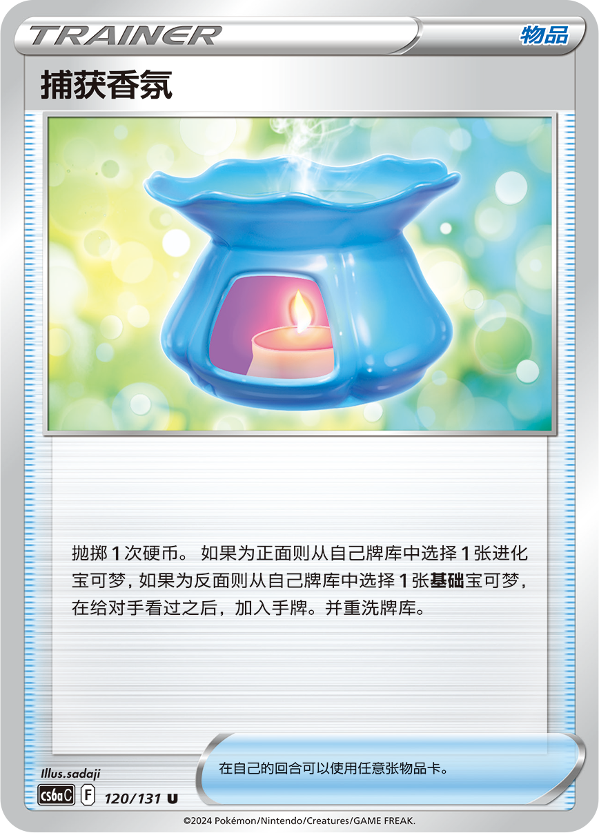首先是同样收录在此次“碧海暗影 啸”中的训练家卡——支援者卡“莎莉娜”和物品卡“捕获香氛”。捕获香氛需要投掷1次硬币,为正面的情况下从自己牌库中选择1张进化宝可梦,反之则选择1张基础宝可梦加入手牌,非常实用。使用莎莉娜则可以将手牌中的始祖大鸟放到弃牌区,为洛奇亚VSTAR的特性“星耀汇聚”做准备。