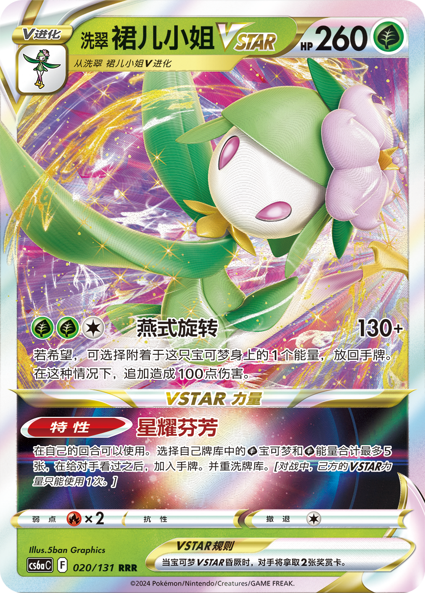 洗翠 裙儿小姐VSTAR的招式“燕式旋转”可以选择附着于这只宝可梦身上的1个能量放回手牌,造成130点基础伤害的同时追加造成100点伤害,非常强力。其VSTAR力量——特性“星耀芬芳”则可以选择自己牌库中的草属性宝可梦和草能量合计最多5张加入手牌。