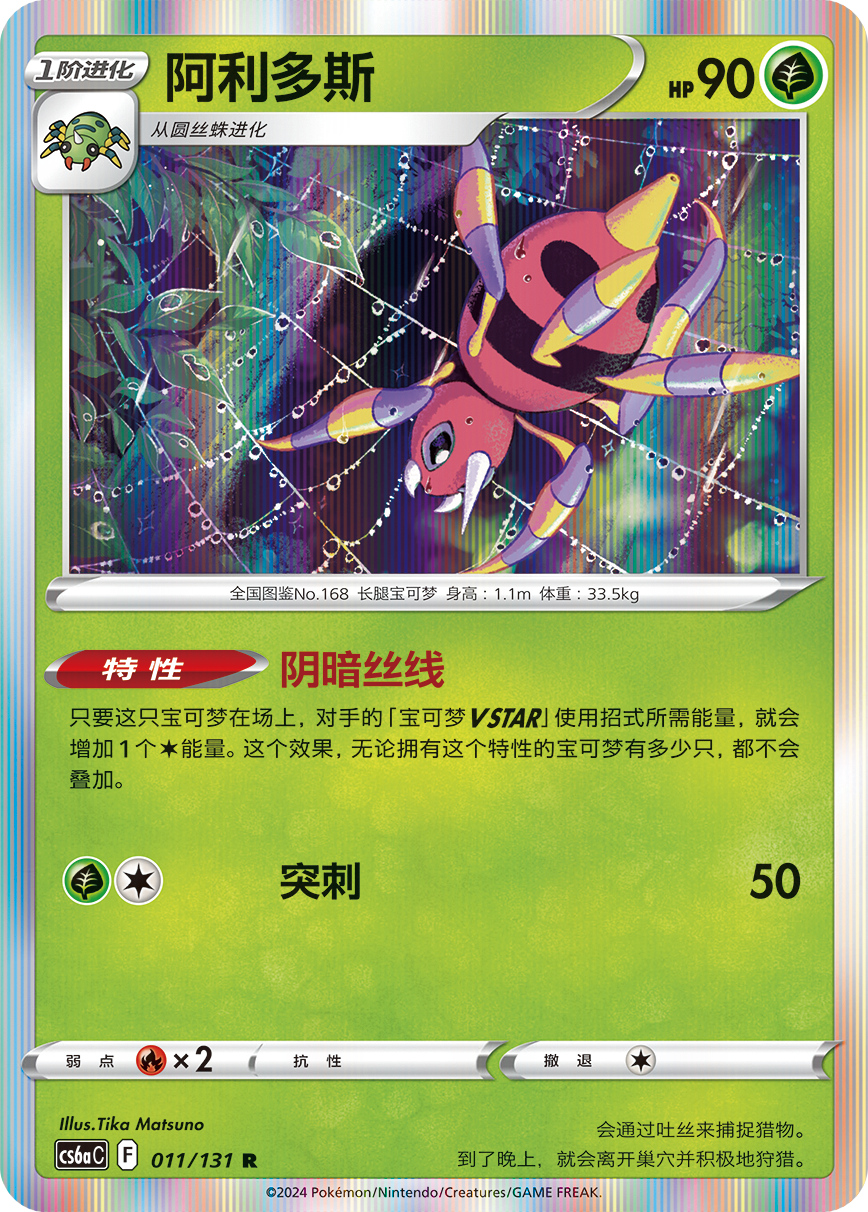 阿利多斯的特性“阴暗丝线”可以让对手的宝可梦VSTAR使用招式所需能量增加一个任意属性能量。配合竞技场卡“神奥神殿”,就有机会打乱对手的进攻节奏。