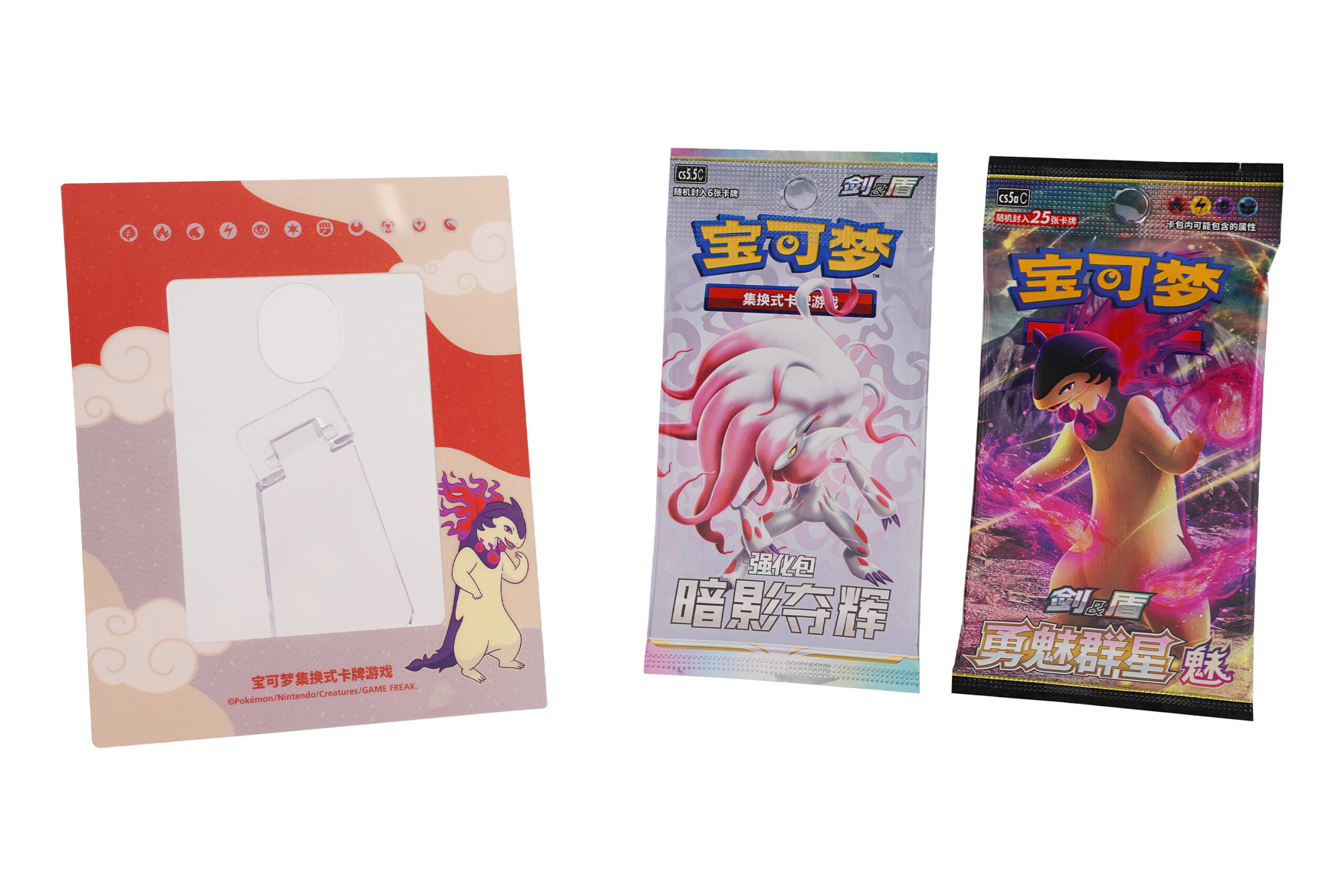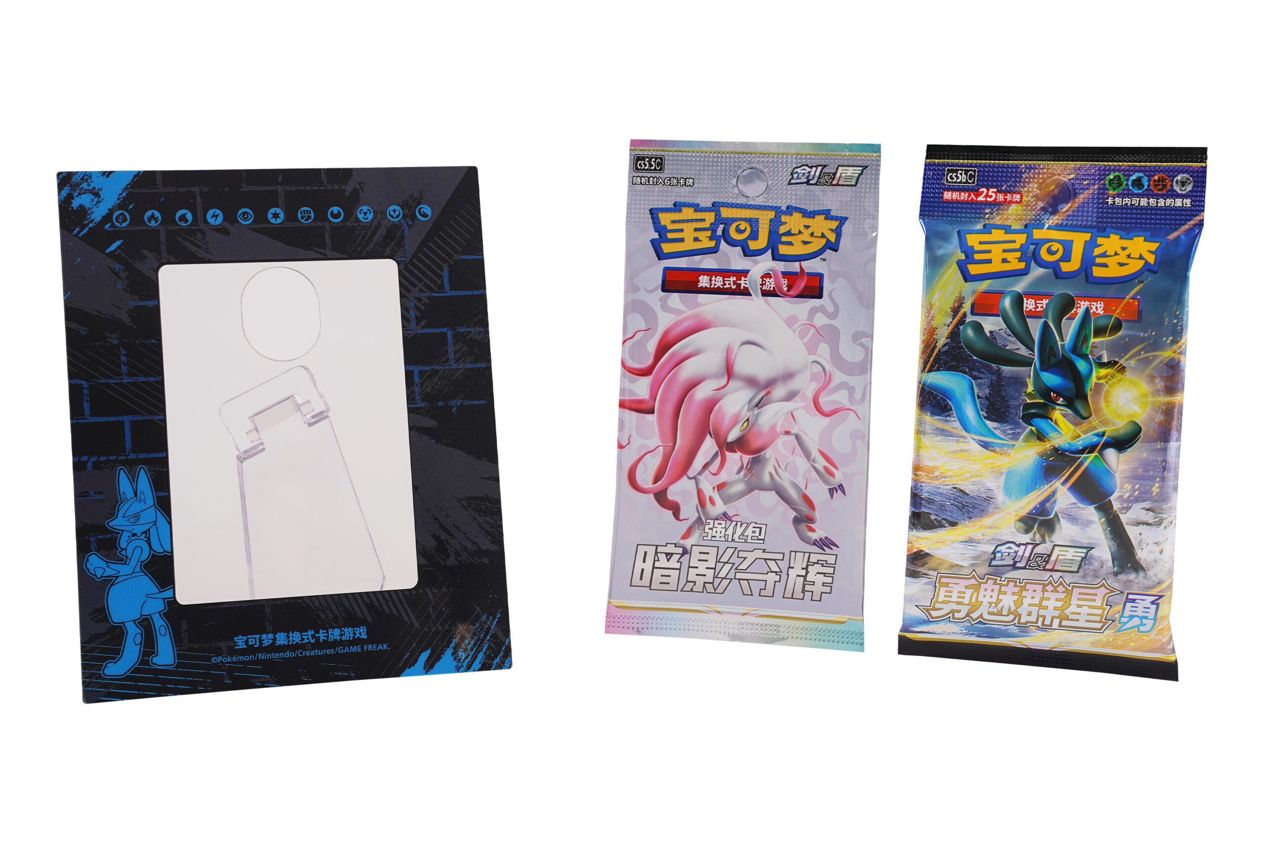 8月2日发售的宝可梦卡牌展示组合分为“宝可梦卡牌展示组合 洗翠火暴兽”和“宝可梦卡牌展示组合 路卡利欧”2款,每款除了含有对应的宝可梦展示卡框之外,还内含“勇魅群星” 补充包和“暗影夺辉” 强化包。