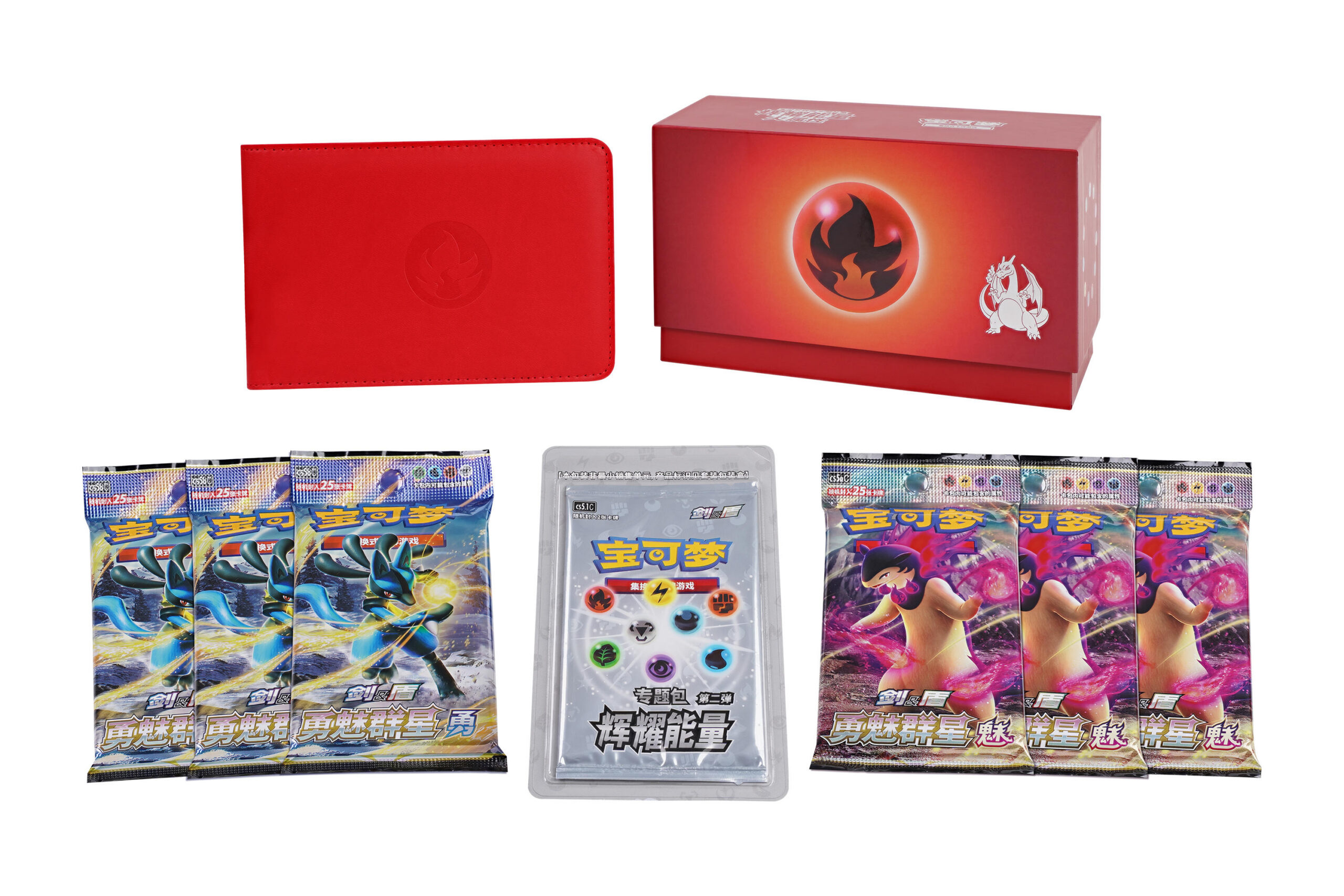| 礼盒内容 | 1.辉耀能量专题包 第二弹(内含2张)1包 2.火属性主题收藏卡册1本 3.“勇魅群星”补充包(25张装)随机6包 4.火属性主题卡牌收纳盒(含2块隔板)1个 |