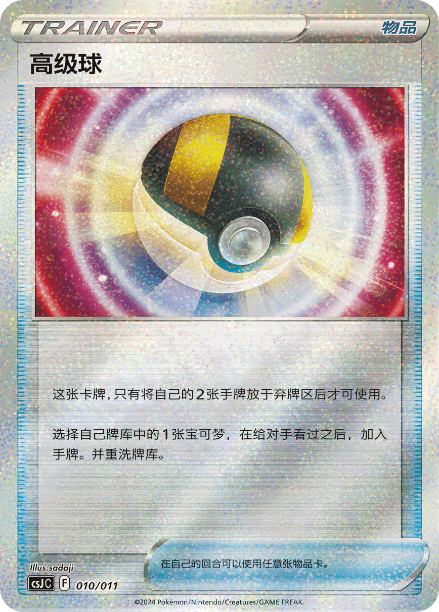 | 商品内容 | ●收纳用高级球 1个 ●宝可梦艺术插画闪卡 1张 ●精灵球闪卡或高级球闪卡或训练家特别插画闪卡 1张 ●随机“九彩汇聚”补充包 1包(25张装规格) |