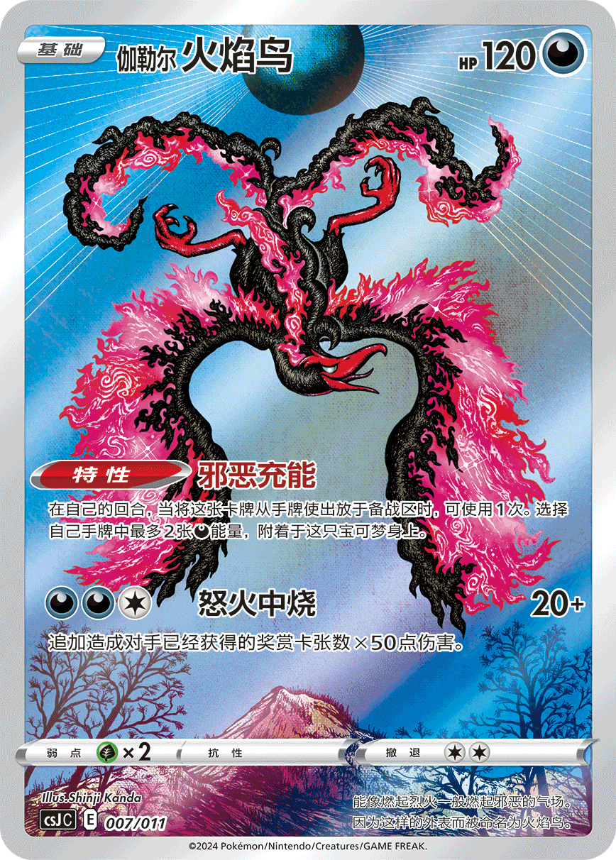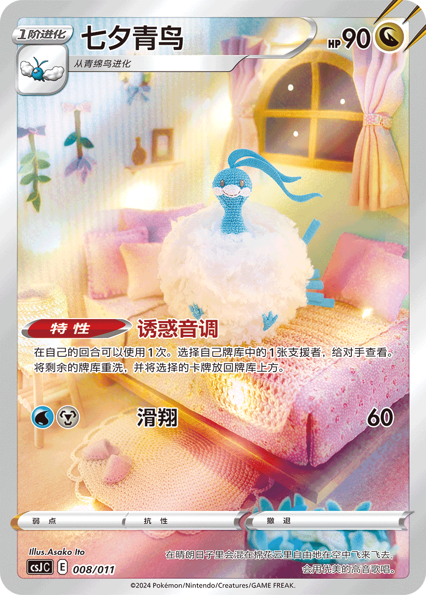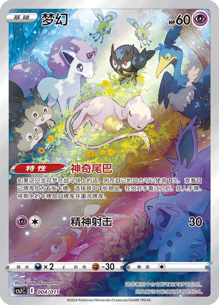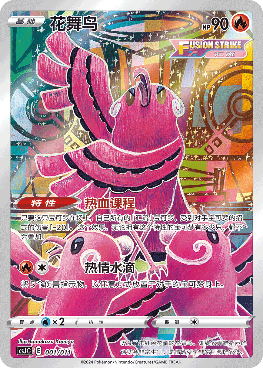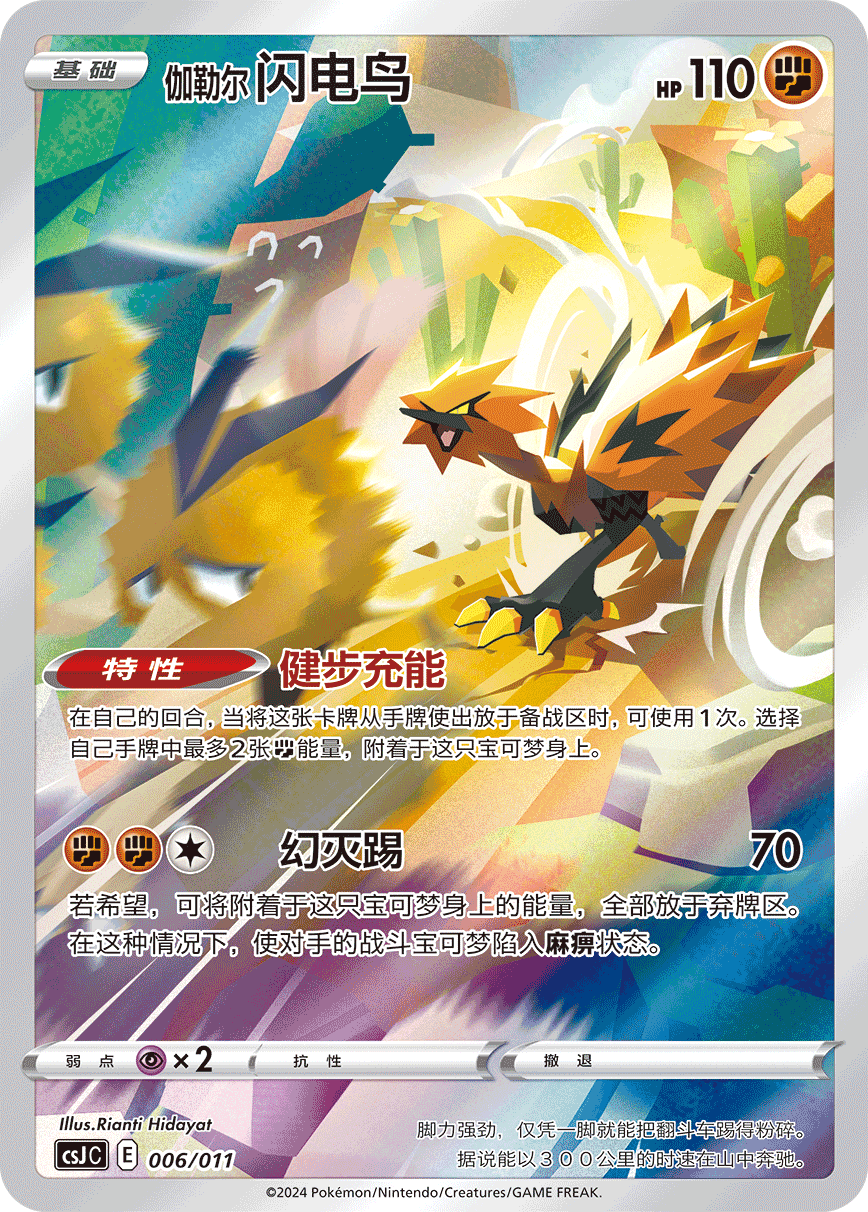 收录的宝可梦艺术插画闪卡共有9种,分别是花舞鸟、颤弦蝾螈、伽勒尔 急冻鸟、梦幻、代欧奇希斯、伽勒尔 闪电鸟、伽勒尔 火焰鸟、七夕青鸟以及拉帝亚斯。这些艺术插画卡的卡面画风各不相同,宝可梦的特征和插画师的个性得到了完美的融合,仿佛带我们进入了卡牌内的“实景”。