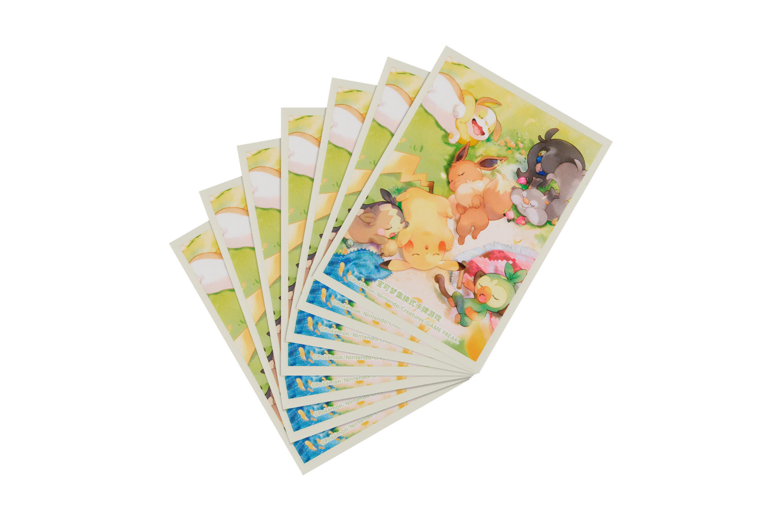 本次对战卡垫的插画描绘了彷佛在一个悠然的午后,皮卡丘、伊布、敲音猴、贪心栗鼠、来电汪以及莫鲁贝可无忧无虑地席地而睡的可爱姿态,让你在激烈的对战之余也能获得悠然的治愈。
