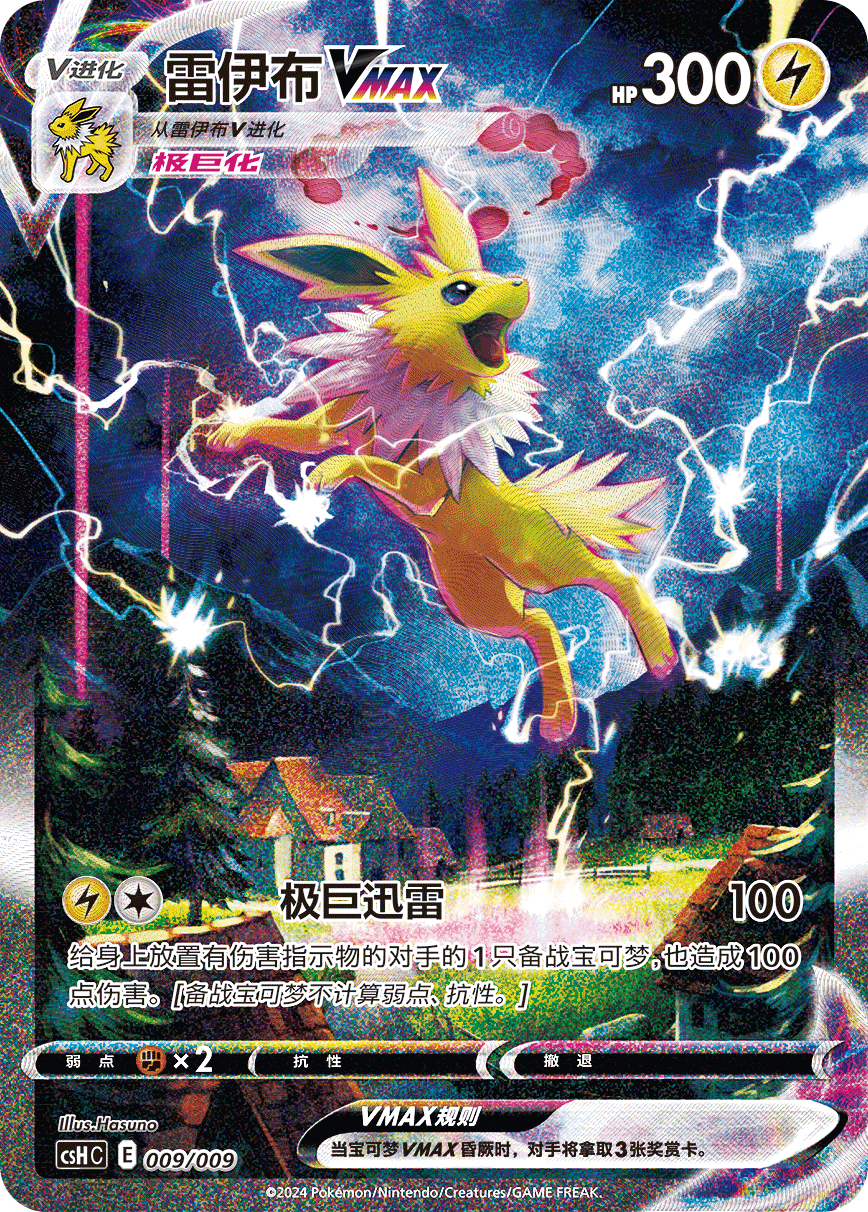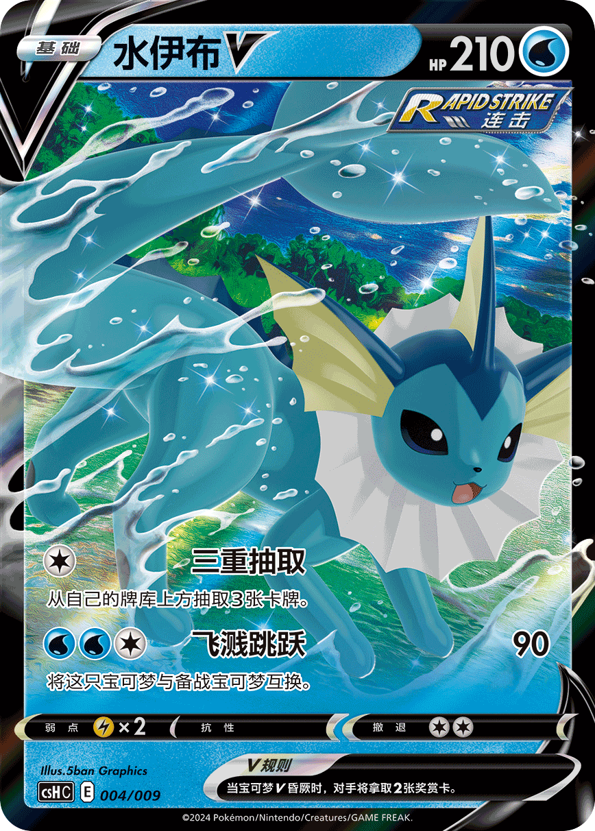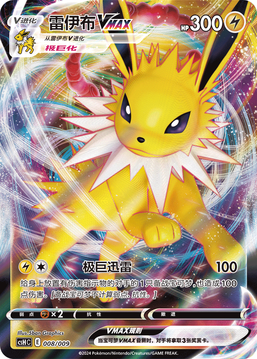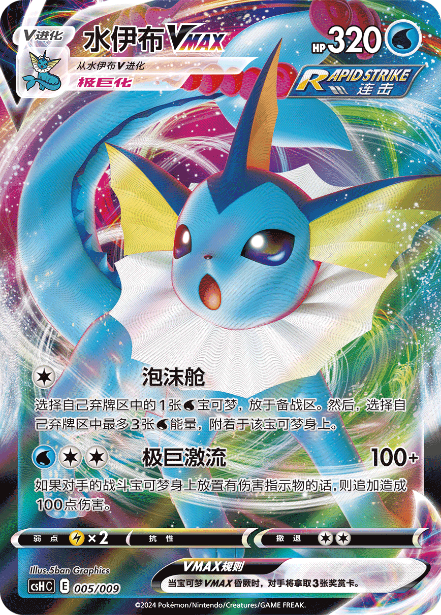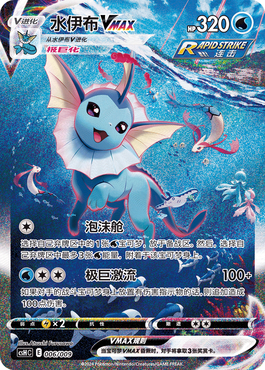 同时,水伊布VMAX、雷伊布VMAX以及火伊布VMAX的特别插画闪卡也分别收录在内,伊布“们”的动人身姿跃然其中,感受它们的“极巨”魅力吧!