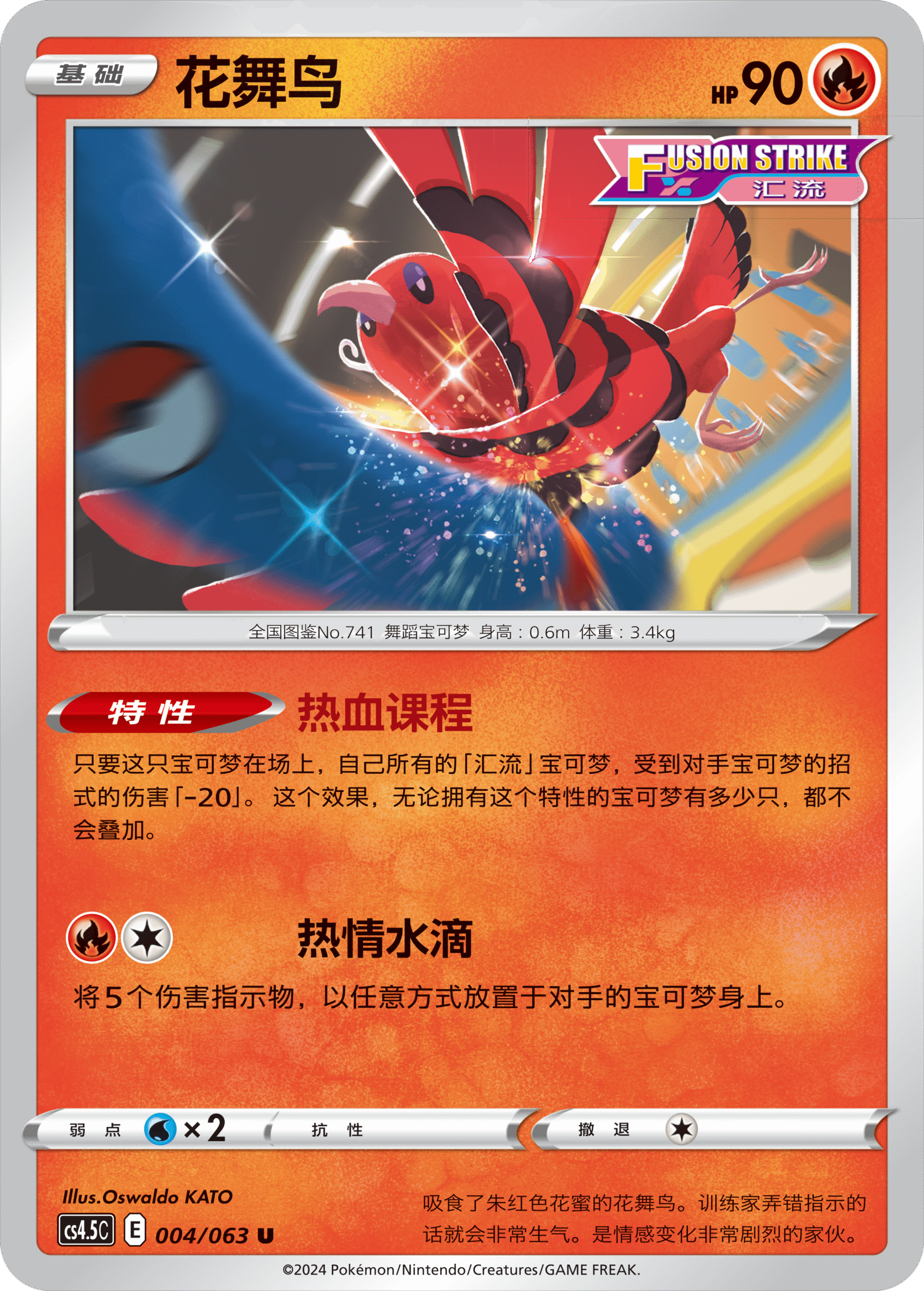 花舞鸟能守护己方的“汇流”宝可梦。在特性“热血课程”的影响下,只要花舞鸟在场上,所有己方的“汇流”宝可梦受到对手宝可梦招式攻击时都能减少20点伤害。 而招式“热情水滴”则是将5个伤害指示物以任意方式放置于对手宝可梦身上,将伤害指示物分散或集中,能够起到骚扰或痛击对手的不同效果,非常好用。