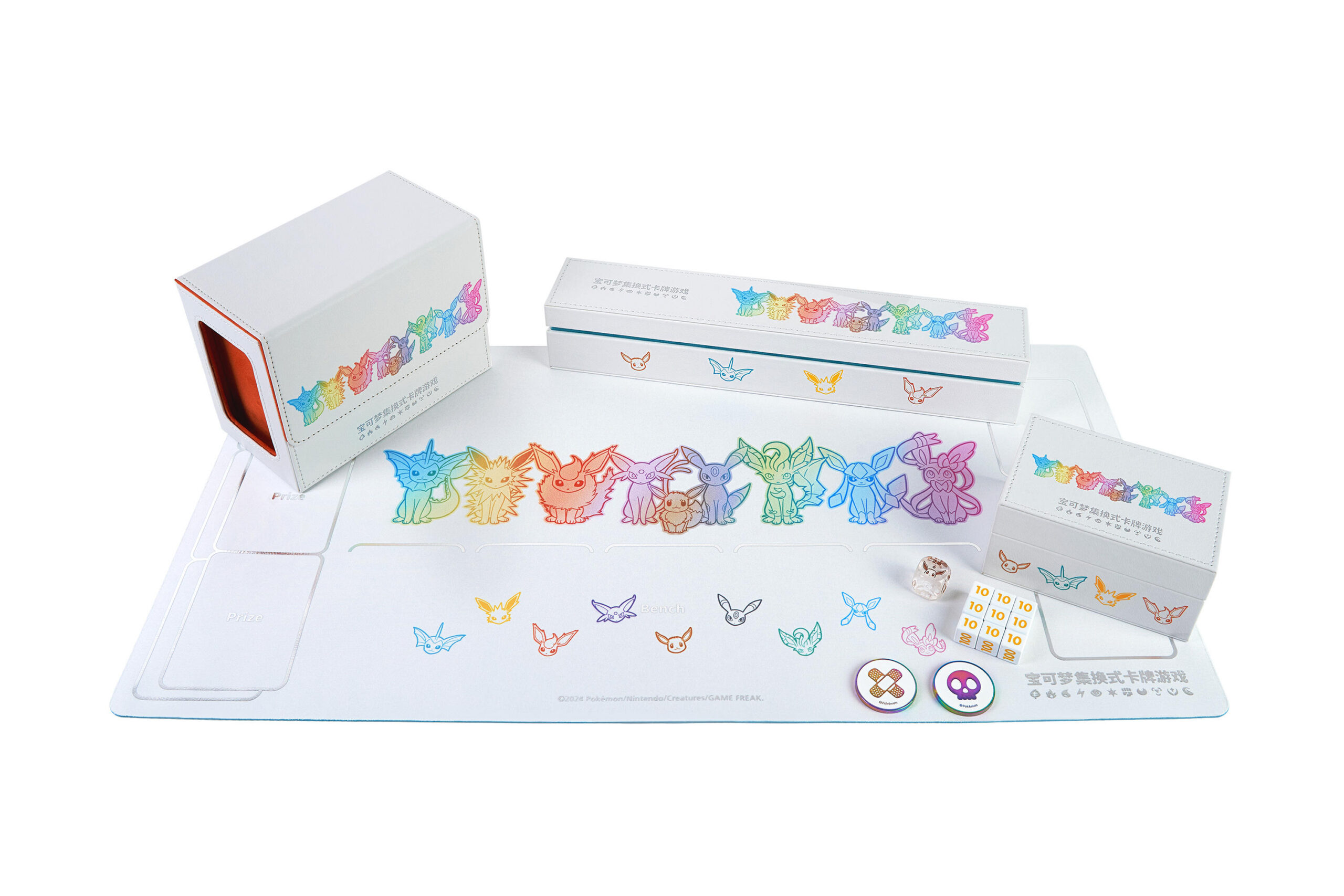 伊布进阶礼盒还内含“焕新”升级的伊布主题对战周边,本系列主题周边包含伤害指示物、主题对战卡垫、各式收纳盒等等,让你成为对战桌上众人瞩目的存在。