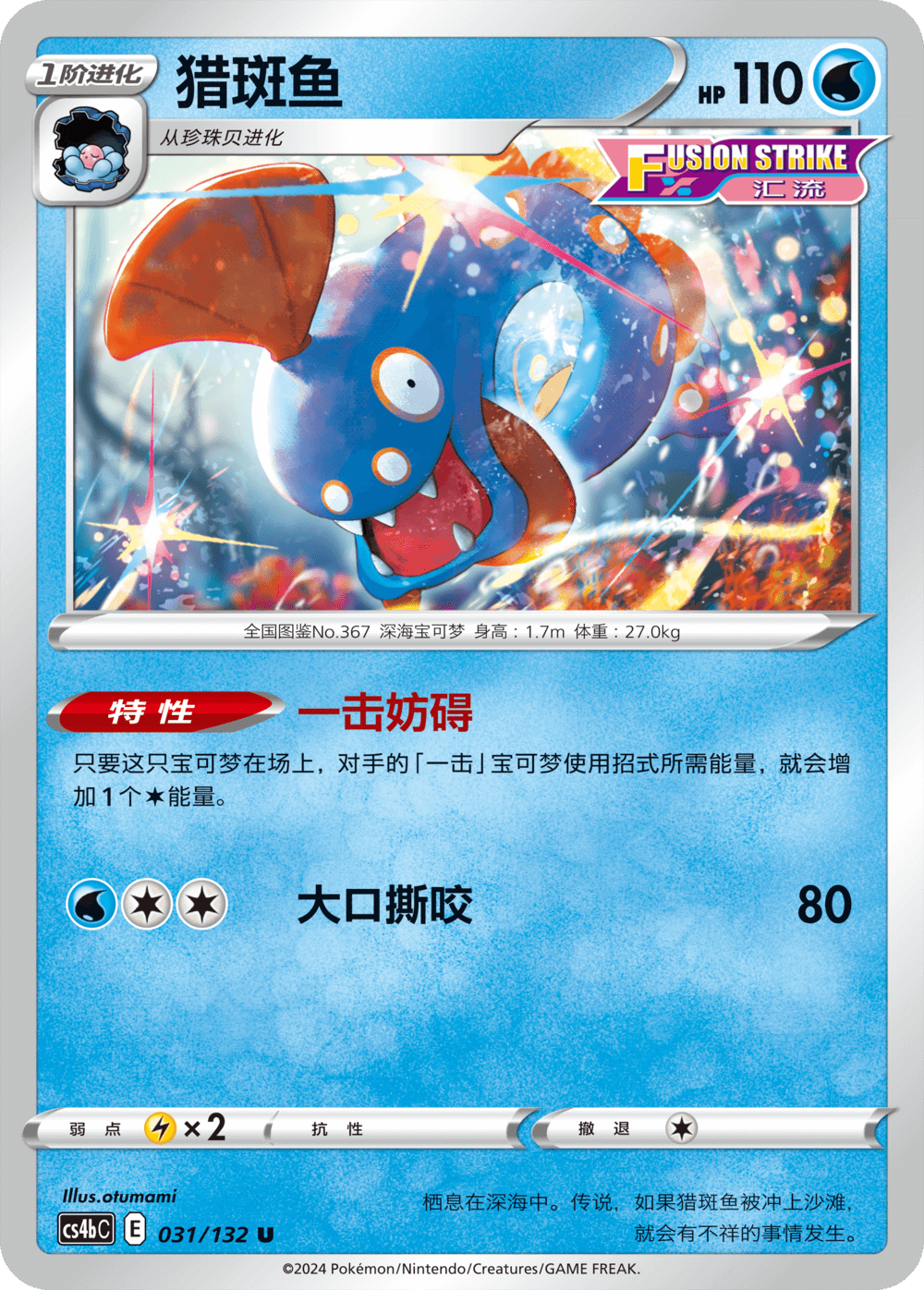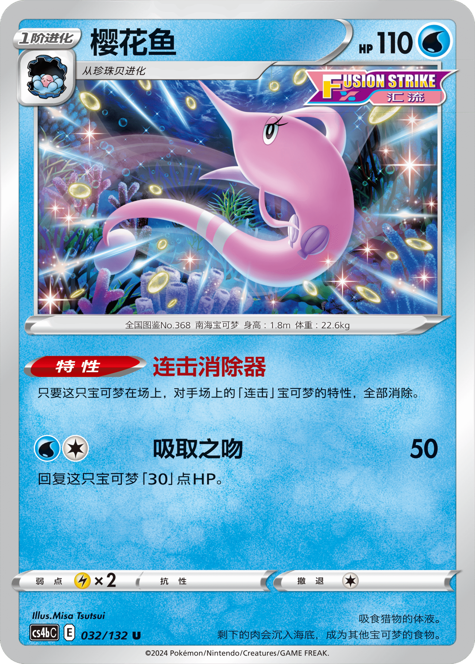 由珍珠贝进化而来的猎斑鱼和樱花鱼都能在对局中严重干扰对手,其中猎斑鱼的“一击妨碍”能让对手的“一击”宝可梦使用招式时需要多附加1个任意属性能量,让对手空有一身本领却无处施展;而樱花鱼的“连击消除器”则能消除对手“连击”宝可梦的特性,若在对手酣战之时成功进行封锁,其前期的精心准备都将功亏一篑。