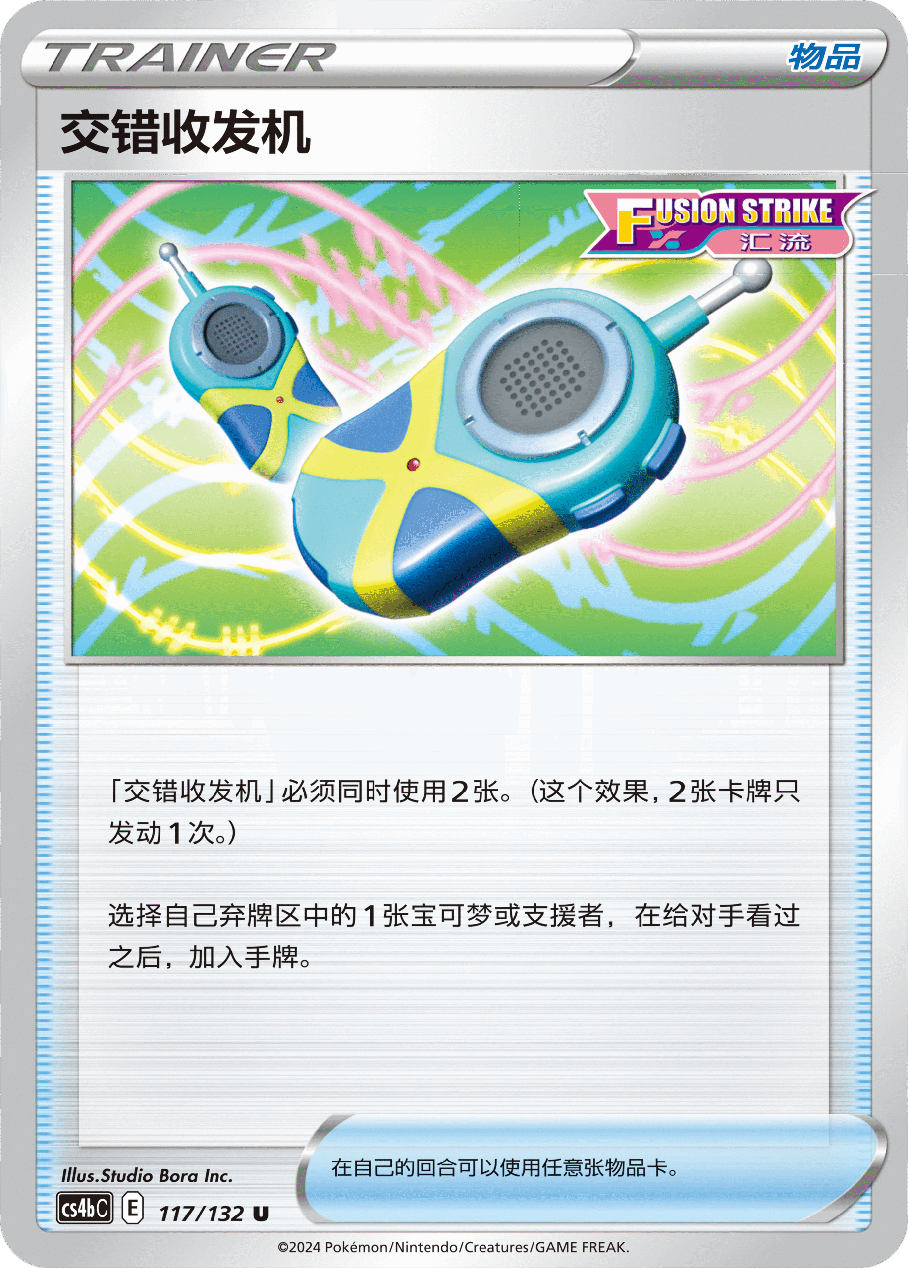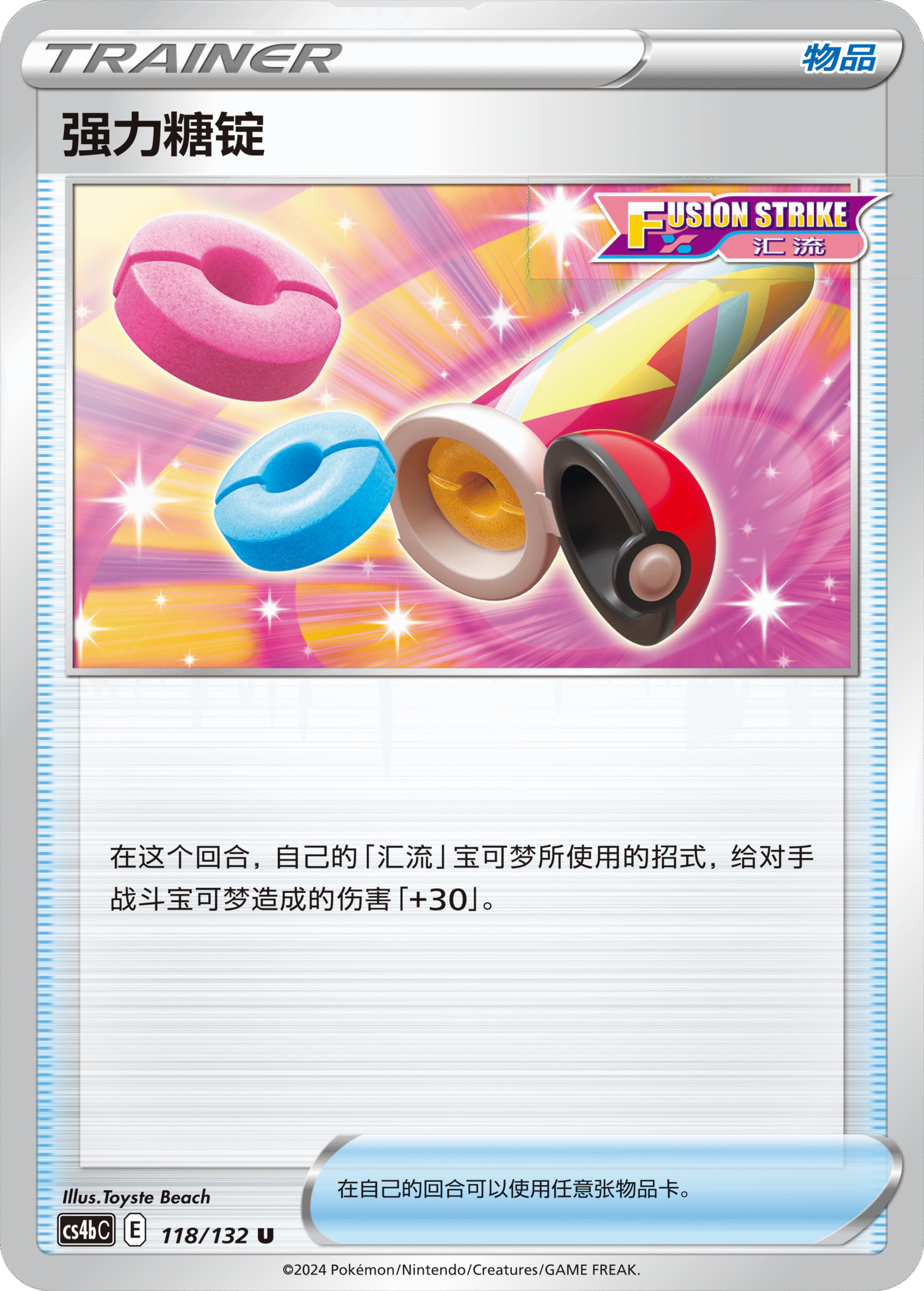 物品卡交错收发机需要同时使用2张才可发动效果,可从自己的弃牌区内任意选择1张宝可梦卡或者支援者卡加入手牌,而强力糖锭在使用后能让当回合己方的“汇流”宝可梦对对手战斗宝可梦的招式伤害+30点,它们都将帮你转变战局。